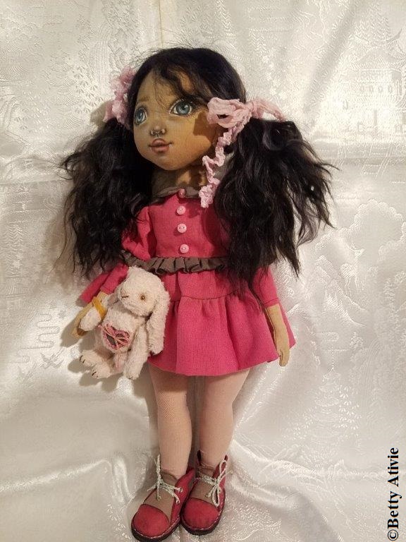 Clothes/Accessories: Handmade cotton dress in burgundy and brown trimming at the collar and waist, multicolored shoes and earrings that match the dress; holds a long-eared tan bunny that has a painted heart decoration on the chest.