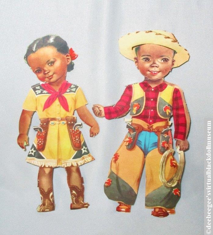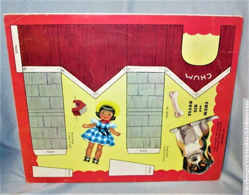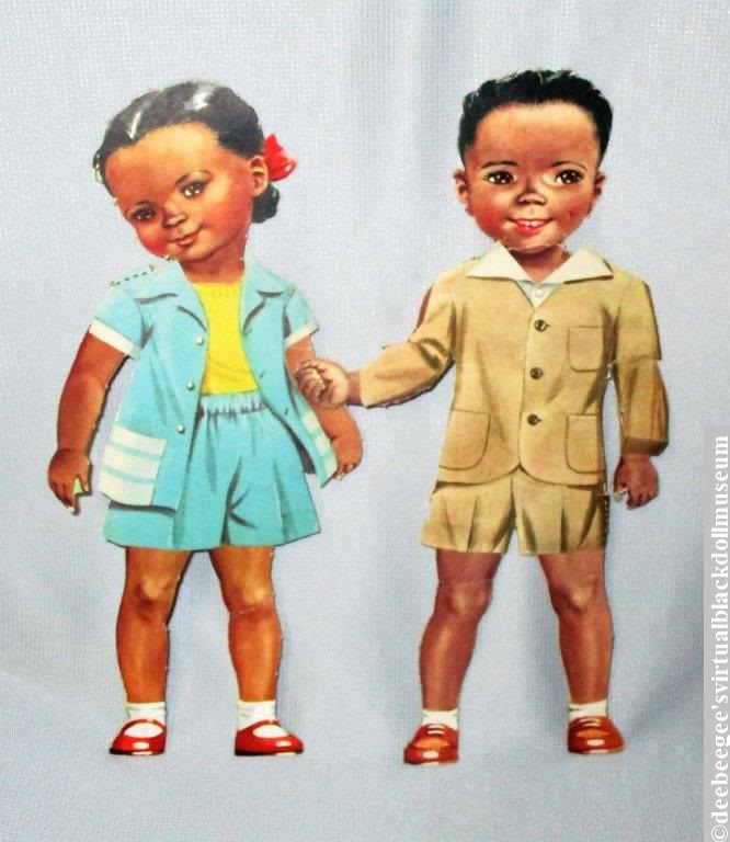 Description: Betty and Billy cut-out paper dolls illustrated on the cover of paper doll book #2129 by Whitman represent two African American children of 1955. The dolls actually punch-out rather than cut-out. There are six pages of fashions and accessories to cut out that represent clothes worn by children in 1955. Billy’s punch-out dog, Chum; his dog house, and Betty’s adorable Black doll are on the back cover of the book along with assembly instructions for the dog house.