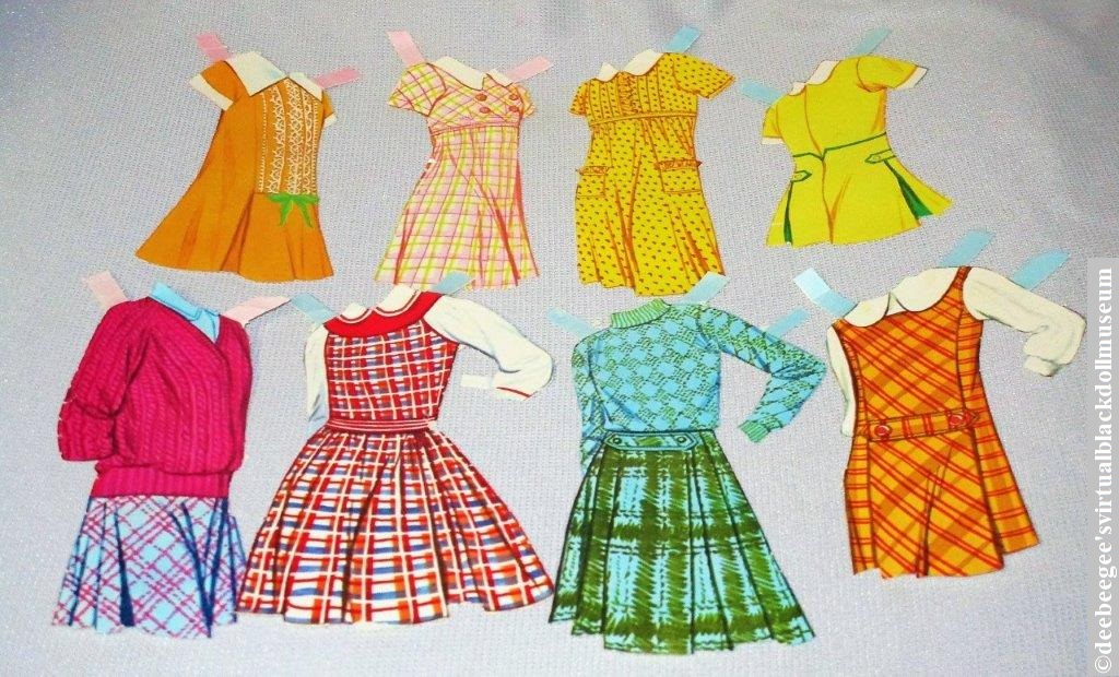 Other: The inside covers illustrate Sue and Kay talking on the phone and Nan and Peg talking to each other by phone. The doors of the two illustrated wardrobes open. There is a missing carry pocket designed to store the dolls’ clothes. For a 1966 paper doll book, this one is unique because of its inclusivity. It features four girls with different complexions and a White teen playing with a Black paper doll.