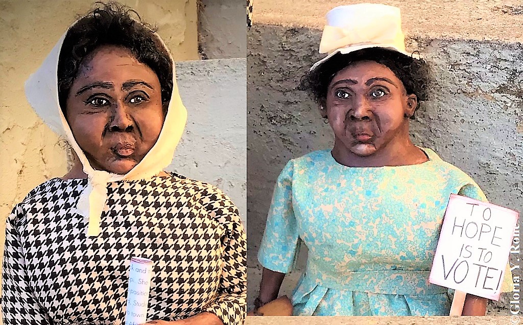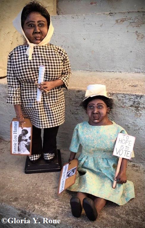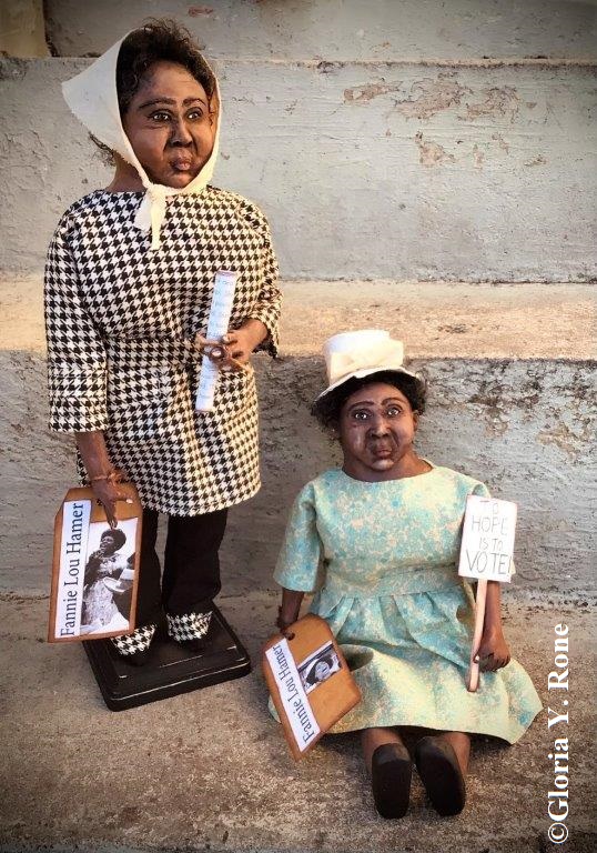 Other: These one-of-a-kind, hand-sculpted polymer clay dolls represent voting rights activist Fannie Lou Hamer. One stands on a wooden plaque. The other is seated and holds a voting sign. Their hangtags bear Hamer’s full name and a headshot image of the voting rights activist.