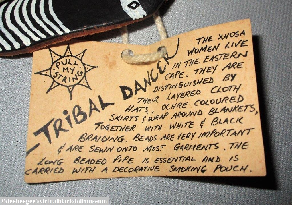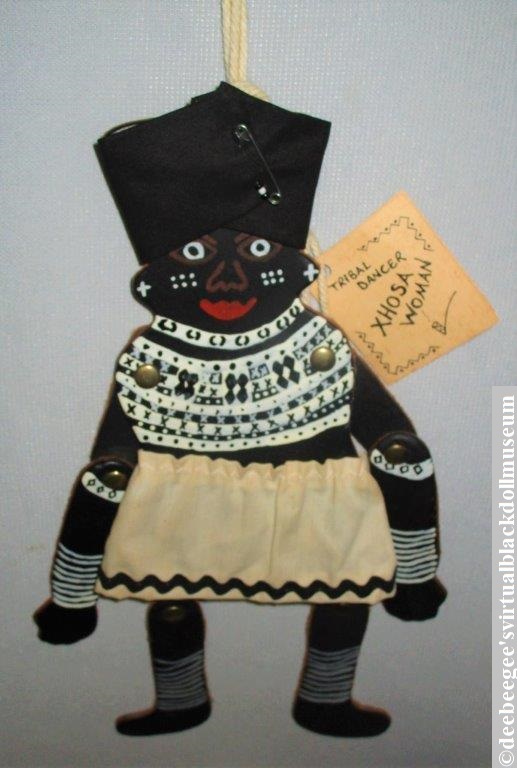 Other: Made to dance by pulling the string, this flat leather figure represents a South African Xhosa woman tribal dancer. The bifold hangtag provides the following printed text,
