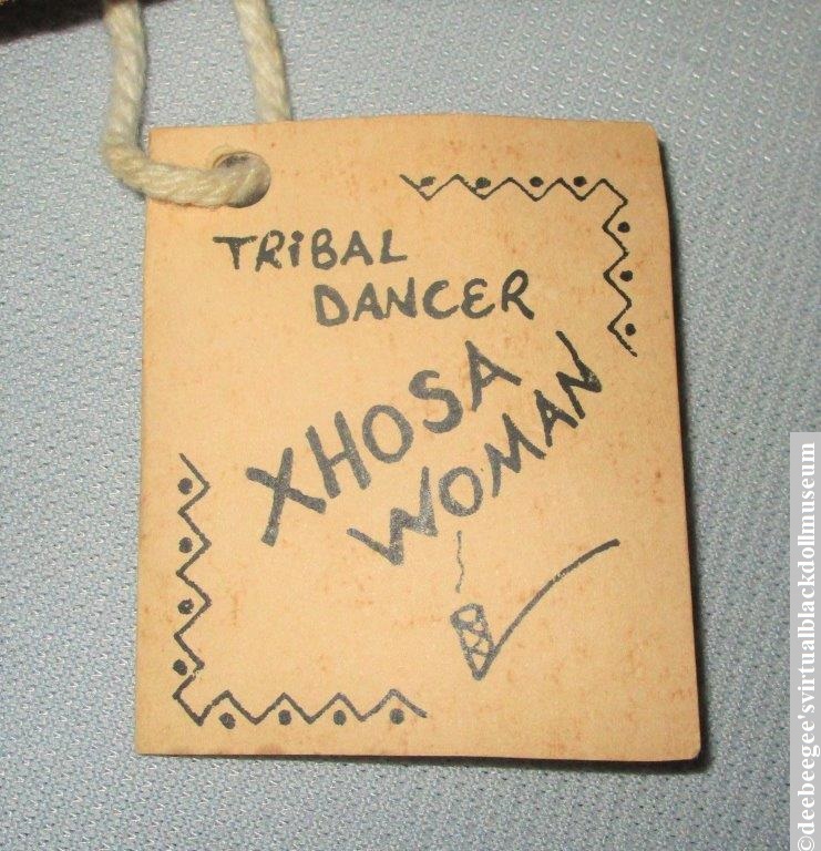 “The Xhosa women live in the eastern cape. They are distinguished by their layered cloth hats, ochre-colored shirts & wrap-around blankets, together with white and black beading. Beads are very important & are sewn onto most garments. The long beaded pipe is essential and is carried with a decorative smoking pouch.” (This figure does not have a pipe or smoking pouch. A pipe is illustrated on the front of the hangtag.)