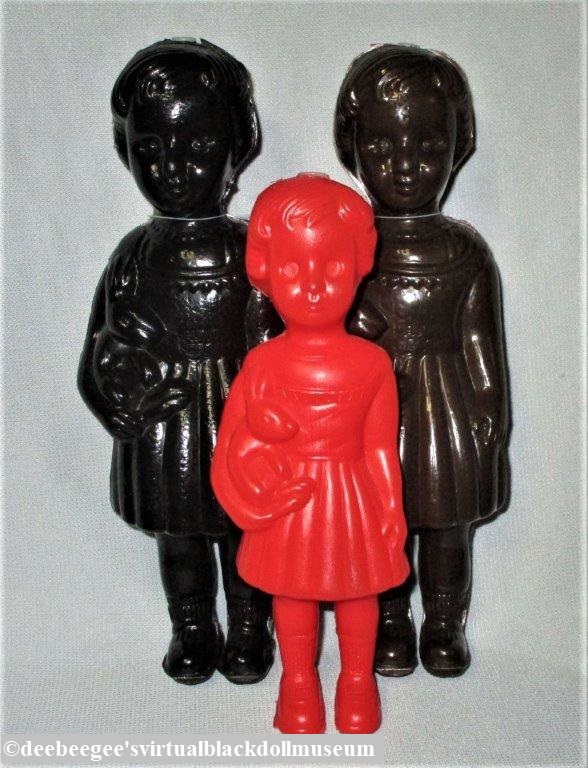 Hair, Eyes, Mouth: Including the figurine, all have sculpted hair. The figurine has two sculpted Afro puffs while the Clonettes’ hairstyle is a sculpted short vintage bob. The plastic dolls have molded facial features. The ceramic figurine’s facial features are painted; it has mauve-colored cheeks and lips which contrast with the ebony complexion.