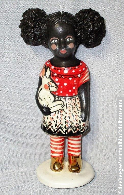 Made by and When: The maker of the colorful Baby DeiDei Clonettes is unknown. The museum acquired these in 2017. Acquired in 2020, the brown and black Baby DeiDe Clonettes were distributed by Clonette Dolls of London. The ceramic figurine was made in 2020 by Fugi Naim of Israel.