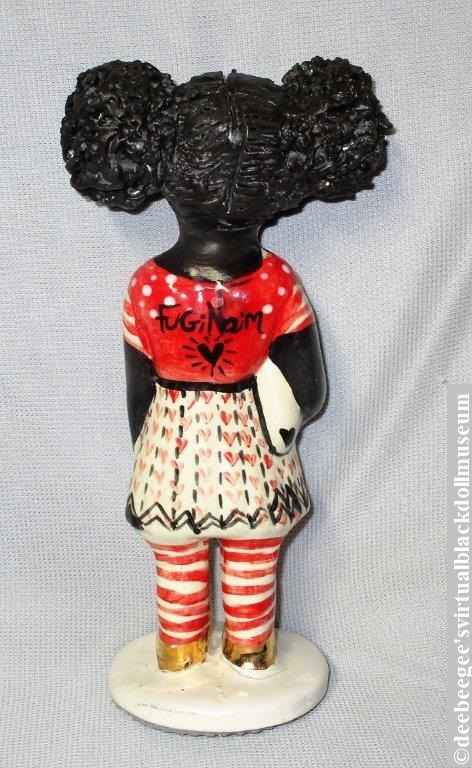 Marks: Colorful Baby DeiDei (unmarked); brown and black versions have a hangtag that reads Clonette Dolls. The back of the ceramic figurine is marked FUGI NAIM (with a black heart painted underneath).