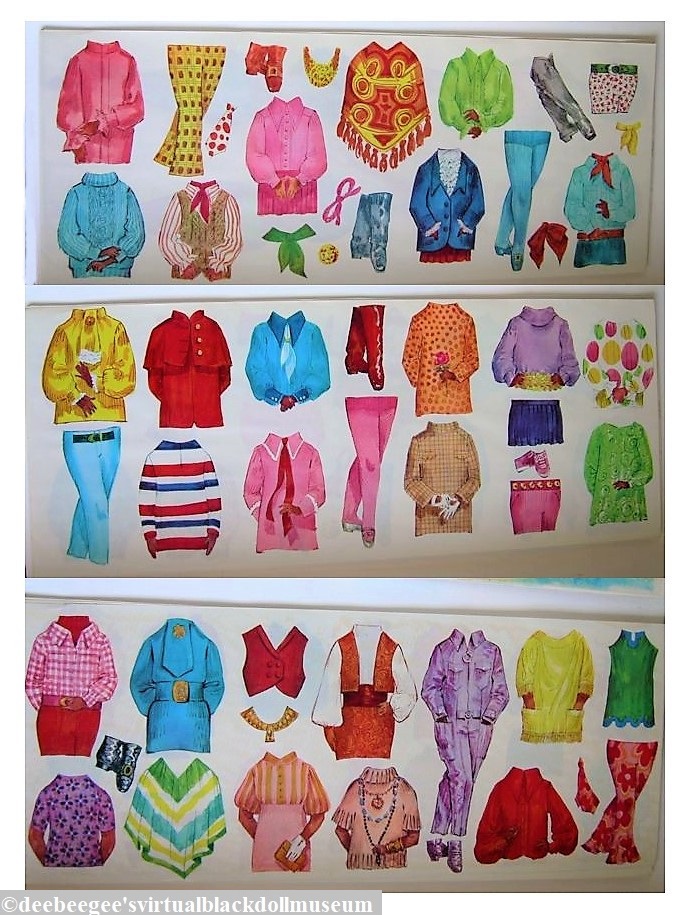 Description: This die-cut, boxed paper doll set, Black is Beautiful, features four girls with big brown eyes. One girl has an Afro; two have short curly hair, and one has straight short hair with bangs. Included are a red magic wand and three sheets of colorful separates (clothing, boots, shoes, jewelry, and other accessories) that reflect 1969 fashion styles. The box reads, “Just touch with the wand and the clothes stay on.” The fashions are actually backed with a sticky substance that adheres to the dolls’ cardboard bodies.