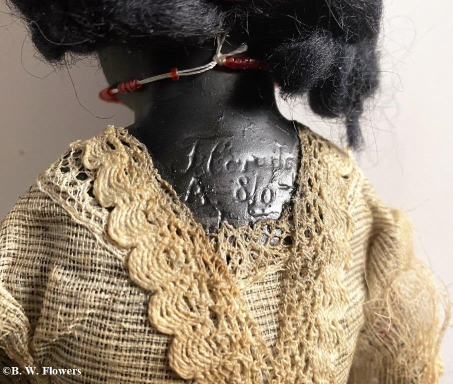 Material: Bisque head, composition or papier-maché arms, stuffed painted-black cloth body with painted feet
