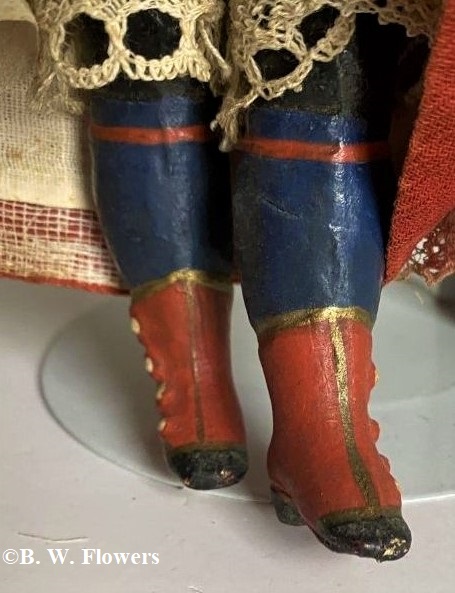 Clothes: The off-white gauze bodice dress has a red skirt. The dress is glued to the body; wears a red beaded necklace, and has painted on side-button boots with gold trim. (The bodice color might have been white originally.)