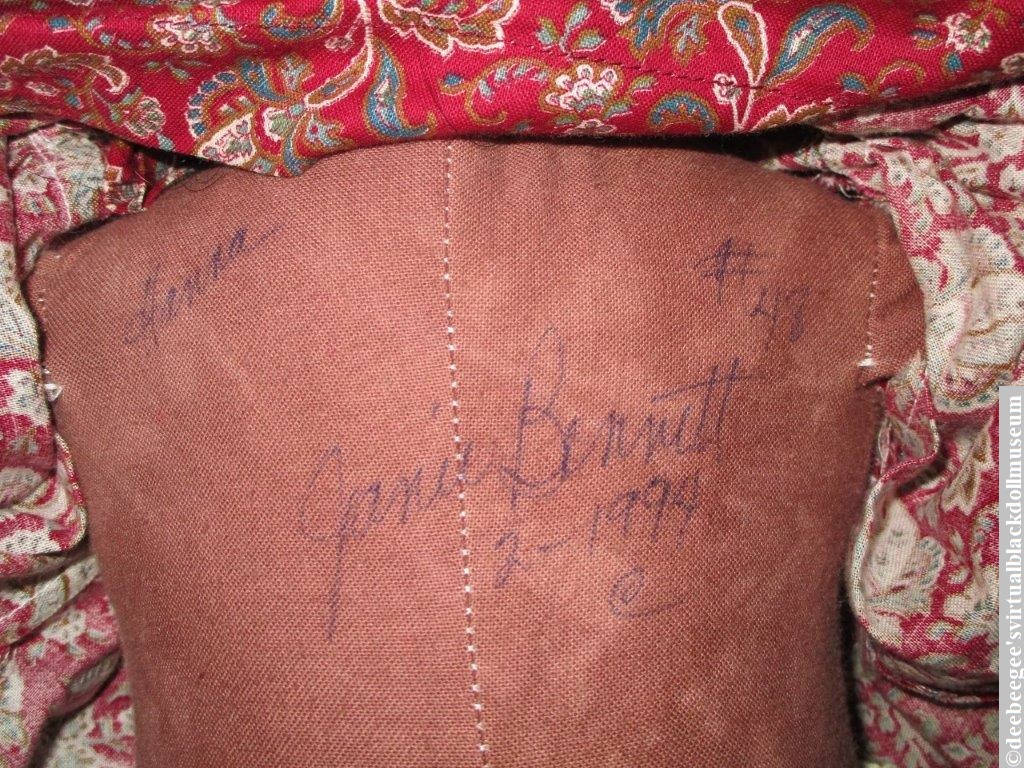 Marks: (Handwritten on the doll’s back) Hanna / #48 / Janie Bennett / 2-94 / © “Hanna” is handwritten on the unstained wooden heart-shaped hang tag that is attached to the left wrist with jute.