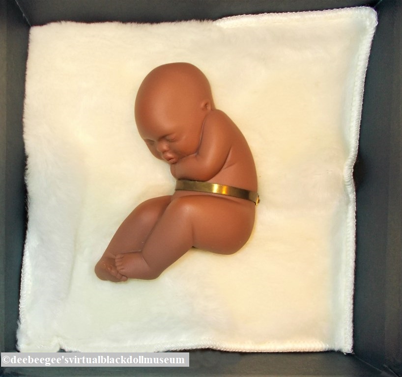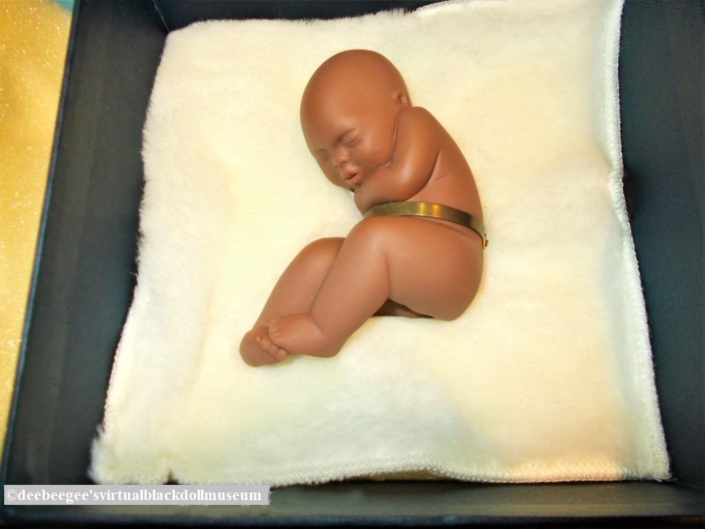 Other: Anatomically correct porcelain baby rests inside a blue gift box on top of a white faux fur lining. It is attached to the lining with a gold-tone metal waistband. The hangtag is attached to an ivory organza bow that adorns the gift box. Inside the hangtag in German: