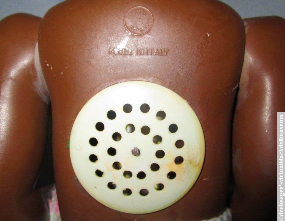 Other: Made in Italy, this lovely doll has factory-painted fingernails and toenails and a non-working voice box in the middle of the back. It was donated to the museum by Jolie van der Klis of the Netherlands who purchased it from another woman in the Netherlands several years before the donation. The doll had been the original owner’s childhood doll. Based on the hoop earrings sewn to the hair, an African tribal garment might have been the doll’s original clothes.