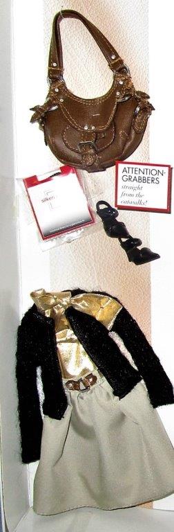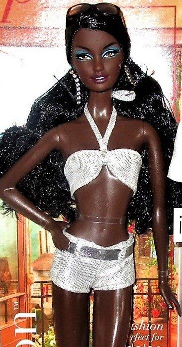 Clothing: Dressed in a two-piece silver lamé bathing suit, crystal drop earrings, black sunglasses placed on top of the head, white high-heel shoes; has two extra outfits. Extra fashion #1: Tan belted skirt, gold lamé blouse, black sweater, black high-heel shoes, and tan faux leather shoulder bag. Extra fashion #2: White silk tuxedo, a black blouse with crystal button closure, black pumps, and a black clutch with crystal closure accent.