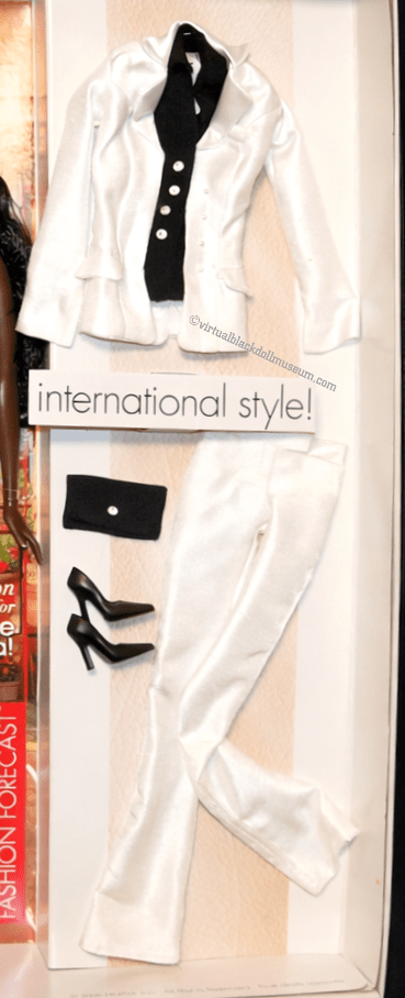 Clothing: Dressed in a two-piece silver lamé bathing suit, crystal drop earrings, black sunglasses placed on top of the head, white high-heeled shoes; has two extra outfits. Extra fashion #1: Tan belted skirt, gold lamé bowed blouse, a black sweater, black high-heeled shoes, and a tan leatherette hobo bag. Extra fashion #2: White silk tuxedo, a black blouse with crystal button closure, black pumps, and a black clutch with a crystal closure accent.