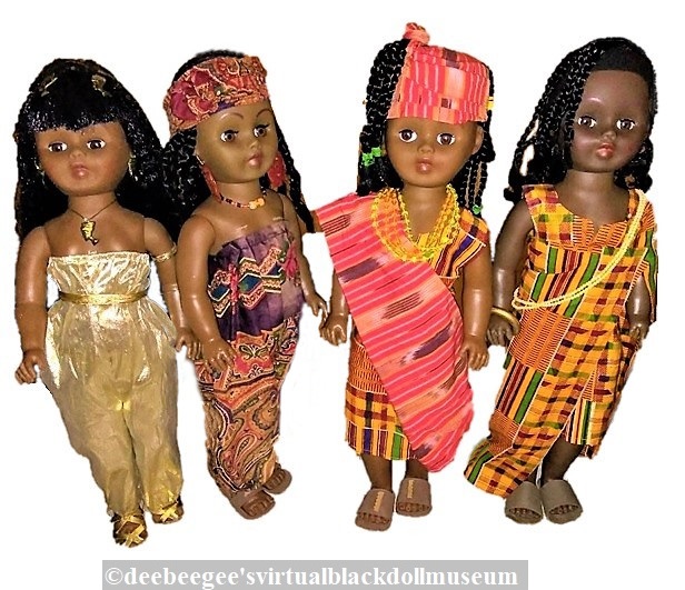 Cleopatra A Keisha, Cleopatra B Keisha, Ashanti Keisha, and another Ashanti Keisha from the Third World Doll Collection were costumed and named after historical figures by the Keisha Doll Company. The jewelry and shoes (with the exception of Cleopatra A’s shoes) were added by the curator. Cleopatra A in the gold lamé one-piece pants has long crimped hair with a hairpiece on top. The others have multiple braids.