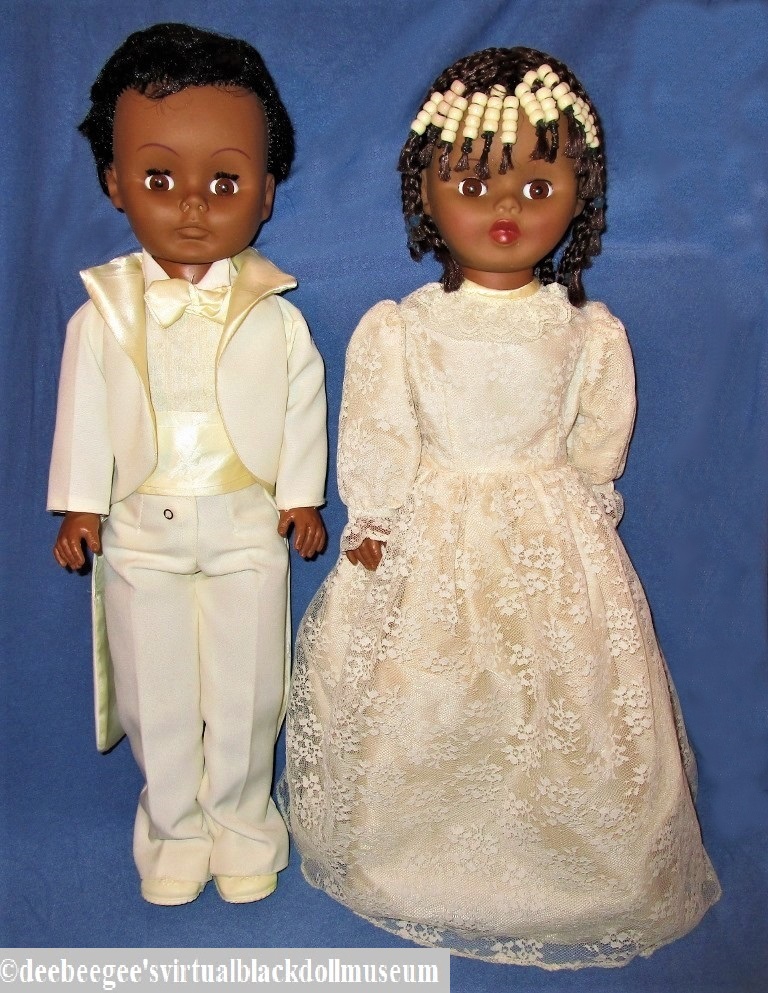 The Groom and Naziah the Bride were catalog numbers 922M and 922, respectively. The groom wears a white gabardine tuxedo with a white sleeveless, lace-front shirt; a white bowtie, cummerbund, white socks, and white mock lace-up shoes. Naziah, which means “companion, friend,” wears a full-length white lace gown that has an attached white satin skirt underneath, white satin undies over white lace stockings, and white satin slippers. This doll’s braids are accented with white beads.