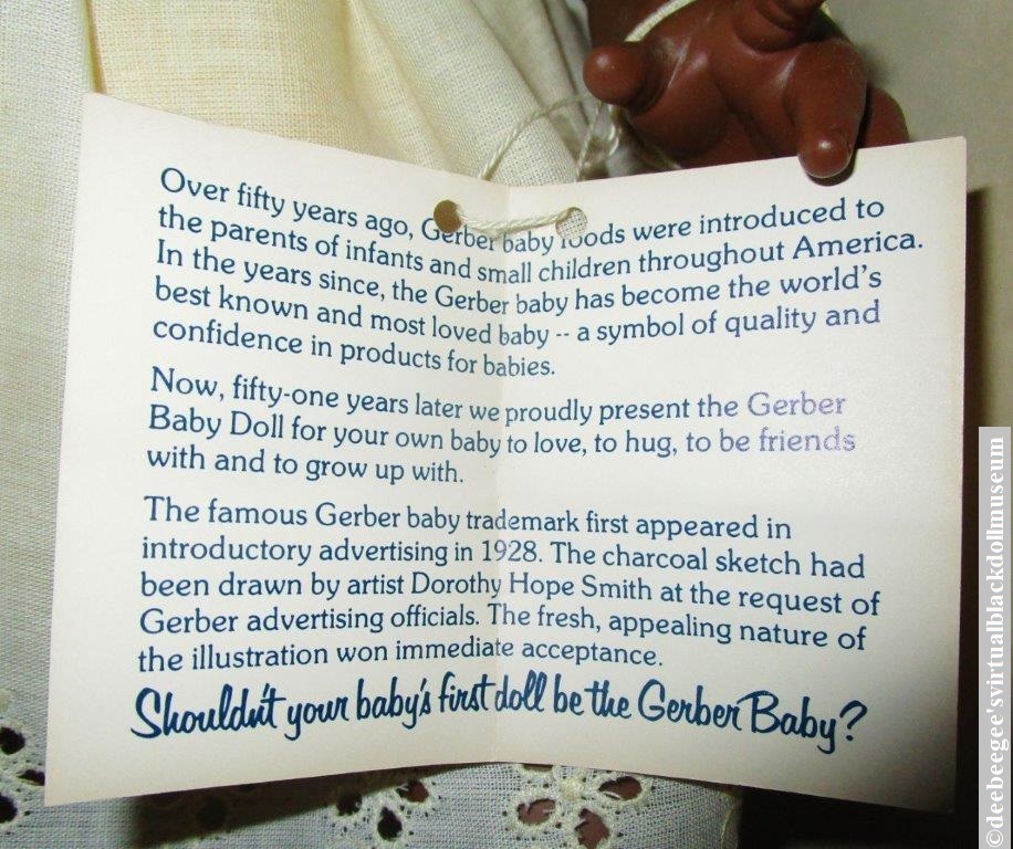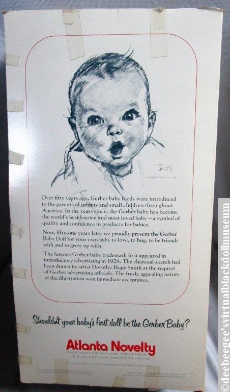 Other: Beginning in 1928, an illustration by Dorothy Hope Smith of the original White Gerber baby as seen on this doll’s hangtag and the back of the box was used to advertise Gerber baby food and other baby products. Both White and Black versions of the doll were manufactured.