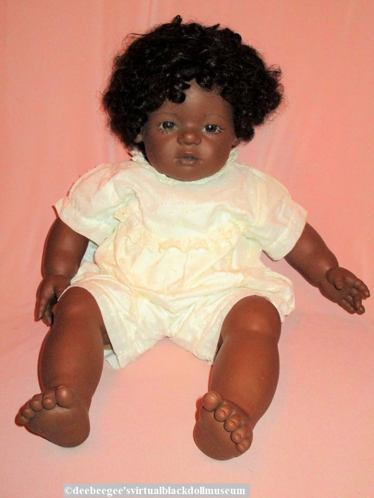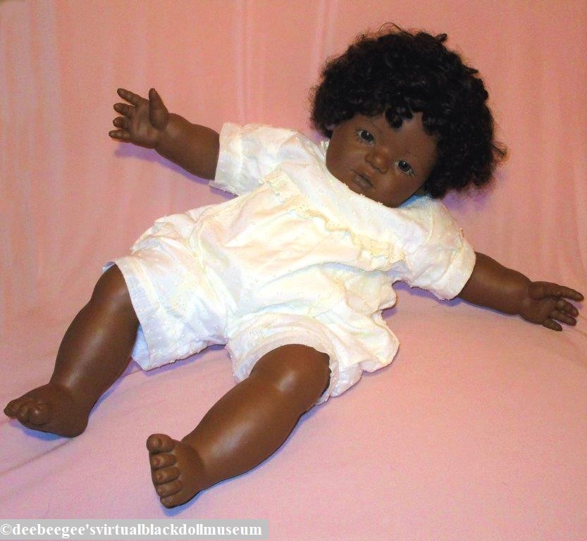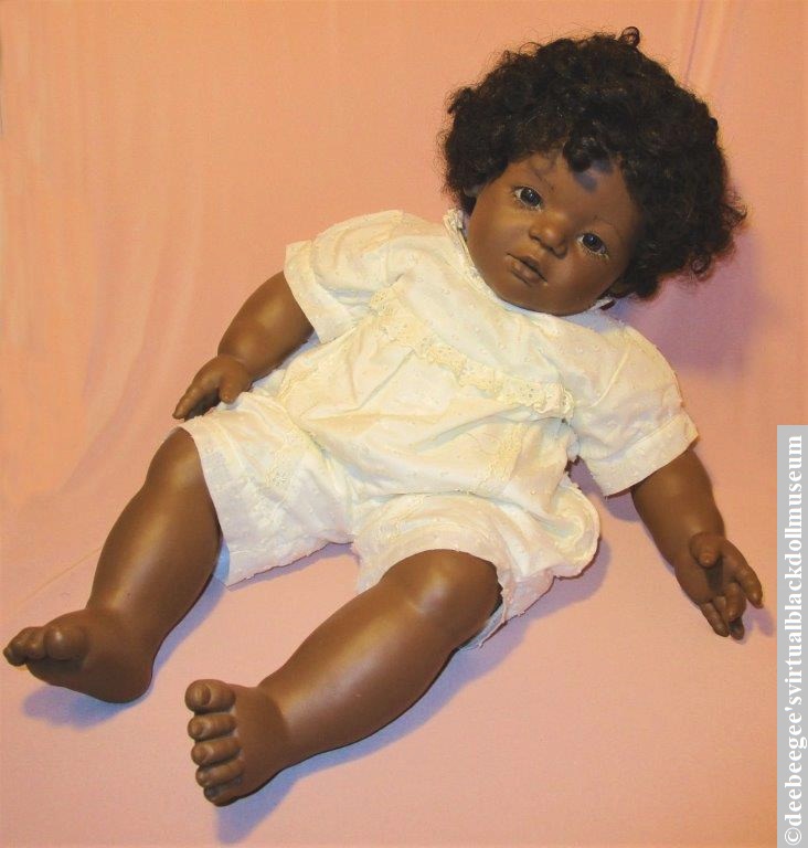 Marks: (Head)Mo / Annette Himstedt©; (at the top edge of both arms and legs) Annette Himstedt©; (white paper body tag) ©1989 Annette Himstedt / Manufactured for Timeless / Creations, the Collectible/ / Specialty division of / Mattel, Inc. / Hawthorne, CA 90250 U.S.A. / MADE IN SPAIN / All Rights Reserved. / REG. NO. PA-60 / ALL NEW MATERIALS. / CONSISTING OF RUBBER PELLETS.