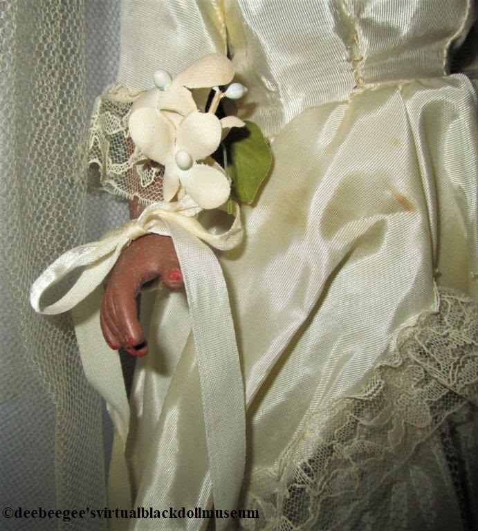 Clothes: Satin ivory bridal gown with V-neck embellishment has lace trim at the neck, sleeves, and at the edge of the skirt in the front. Two vertical ribbons accent the netting which is the second layer of the skirt. The third layer of the skirt is satin. The netting of the veil is attached to a strip of lace-trimmed satin. A crinoline mesh pinned-on half-slip, white knit panties, white vinyl high-heel shoes, pearl drop earrings, and a white floral bouquet complete this doll’s bridal fashion statement.