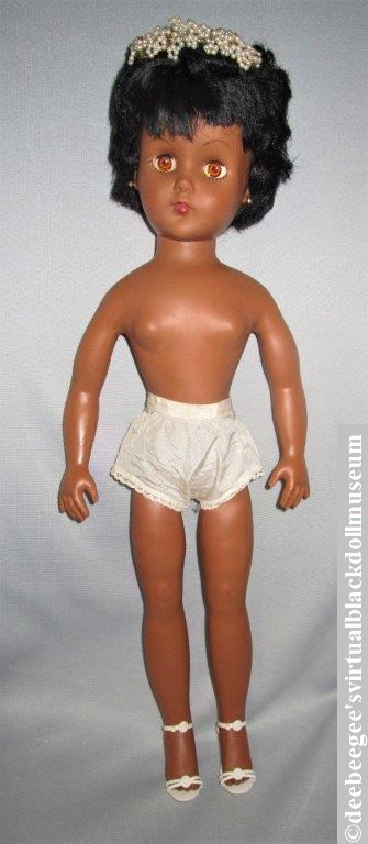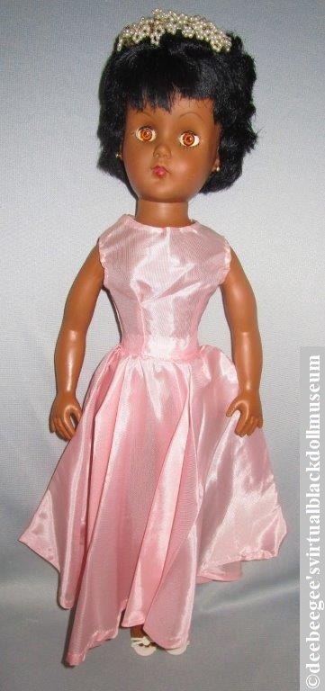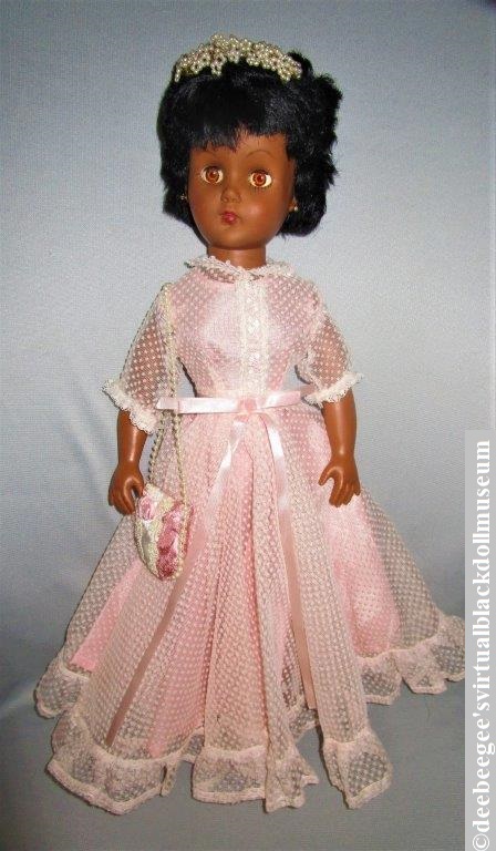 In the mid 1960’s, my sister and I got dolls for Christmas that were dressed in white, long lacy-look gowns, had blue ribbons across their chest, had a crown and a scepter. They were African-American beauty queen dolls. The face sculpt was similar to the doll in this article; the hair was styled in short, curly black coils. I have not been able to find any images or information on the doll my sister and I owned in the mid 1960’s.