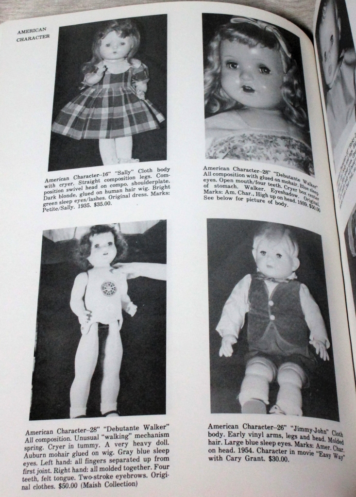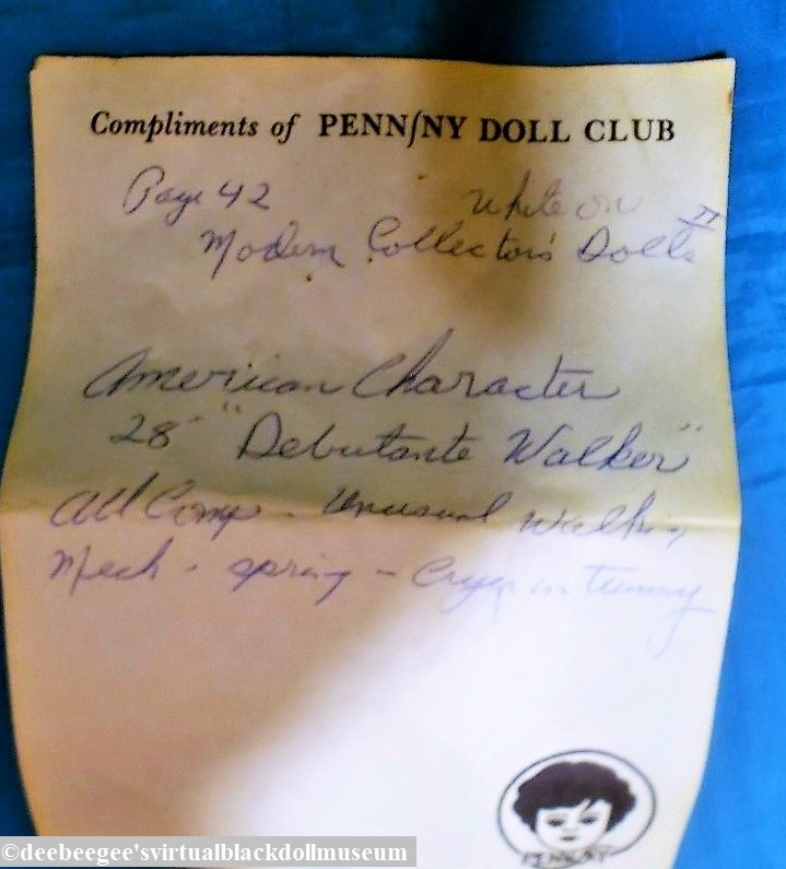 Upon arrival into the curator’s collection during the late 1990s, this doll had a handwritten note tucked inside the undergarment, written on paper Compliments of PENN/NY Doll Club. The handwriting reads: Page 42 Modern Collector’s Doll II [white on]. American Character 28 inch Debutante Walker. All composition. Unusual walking mech. Spring. Cryer in tummy.” The writer probably meant to write “white one.”