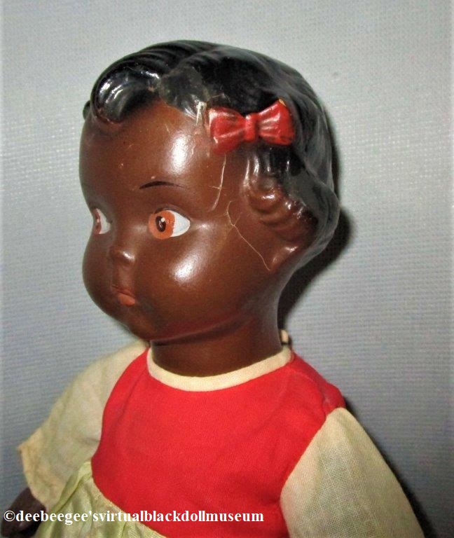 Other: On page 132 of Black Dolls an Identification and Value Guide Book II by Myla Perkins, published in 1995 by Collector Books, this doll is described as, “12”. Composition Patsy look-alike with molded hair, molded red bow on left side near part in hair, painted intaglio eyes, closed mouth, jointed composition arms and legs. Body is one piece with the head. Unmarked. Redressed. 1920-30. A marked Effanbee doll has the same molded hair.”