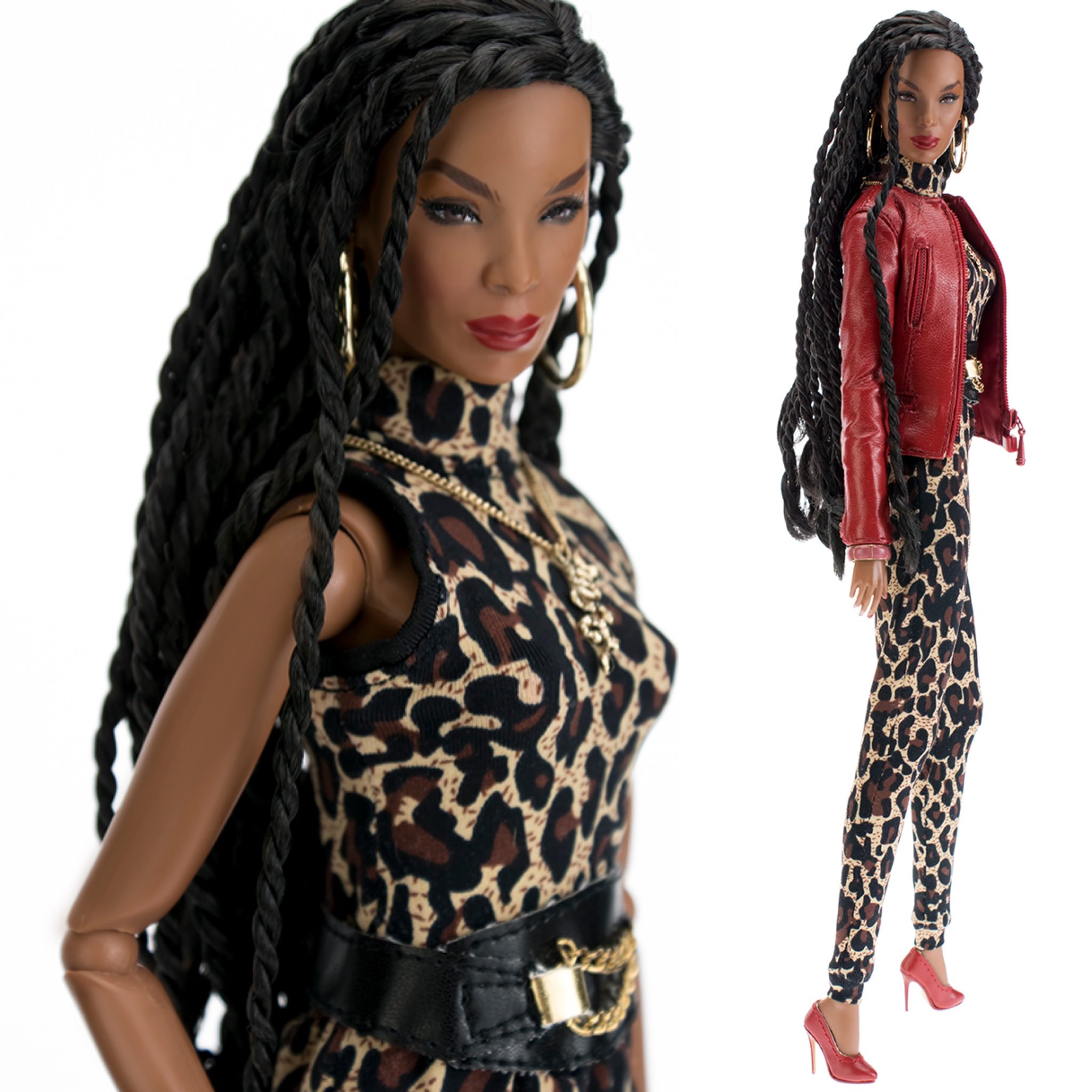 Clothes and Accessories: The fashion, worn during the character’s first appearance on American Horror Story: Coven, includes a red faux leather jacket with non-functioning zipper pockets and a belted leopard-print one-piece jumpsuit. Accessories: Separately packaged red pumps with gold insoles, gold hoop earrings, a bangle bracelet, and the signature snake pendant necklace from the TV series (see the first gallery photograph). Also includes a separately packaged doll stand.