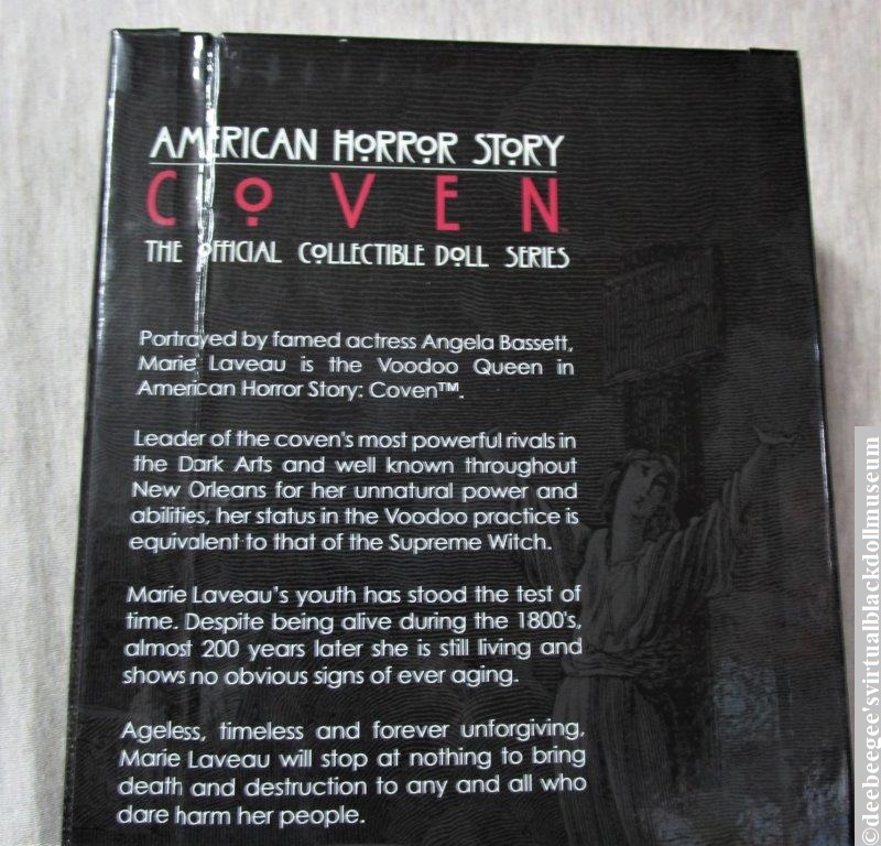 Other: Integrity Toys collaborated with American Horror Story and Twentieth Century Fox Film Corporation to create the Marie Laveau doll. Made in a limited edition of 600, this portrait doll of Angela Bassett’s Marie Laveau character from the TV series captures Bassett’s likeness almost to perfection. Ms. Bassett’s face extends from the left corner of the box front to the side of the box. A description of Bassett’s Marie Laveau character is included on the back of the box. In real life, “Marie Laveau is the legendary former Voodoo Queen of New Orleans… Her status in the Voodoo practice is equivalent to that of the Supreme in Witchcraft” (Marie Laveau). “The TV series tells the secret history of witches and witchcraft in America”(American Horror Story).