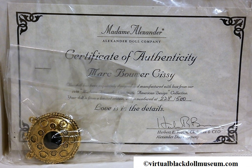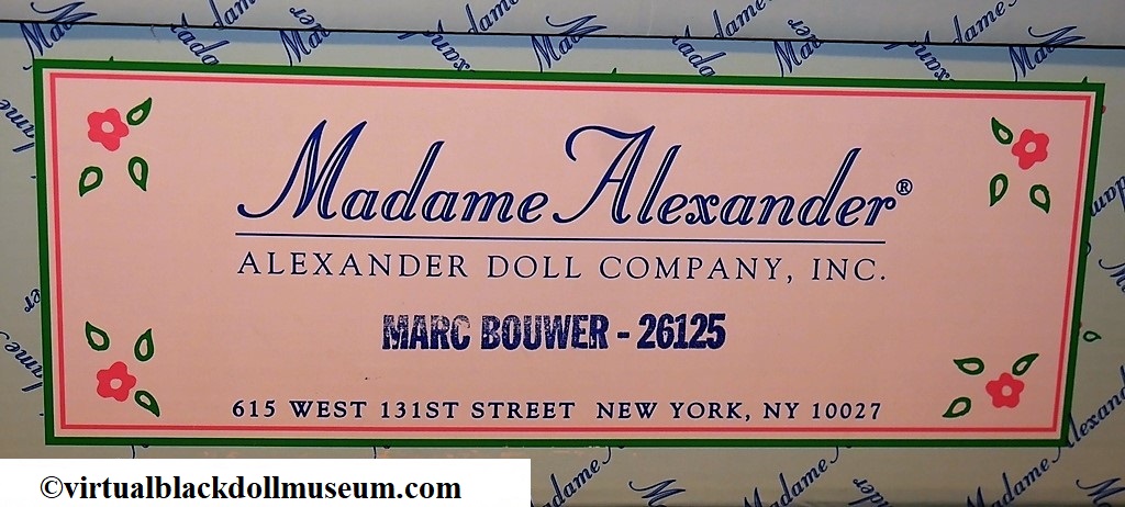 Other: The first Cissy by Madame Alexander was released in 1955; however, none of the first dolls were Black or African American. Black versions debuted during the late 1990s. Designed by South African/New-York-based fashion designer Marc Bouwer for Madame Alexander, the Black Marc Brouwer Cissy is style #26125. That number is indicated on the bottom end of this doll’s box. A certificate of authenticity reads: