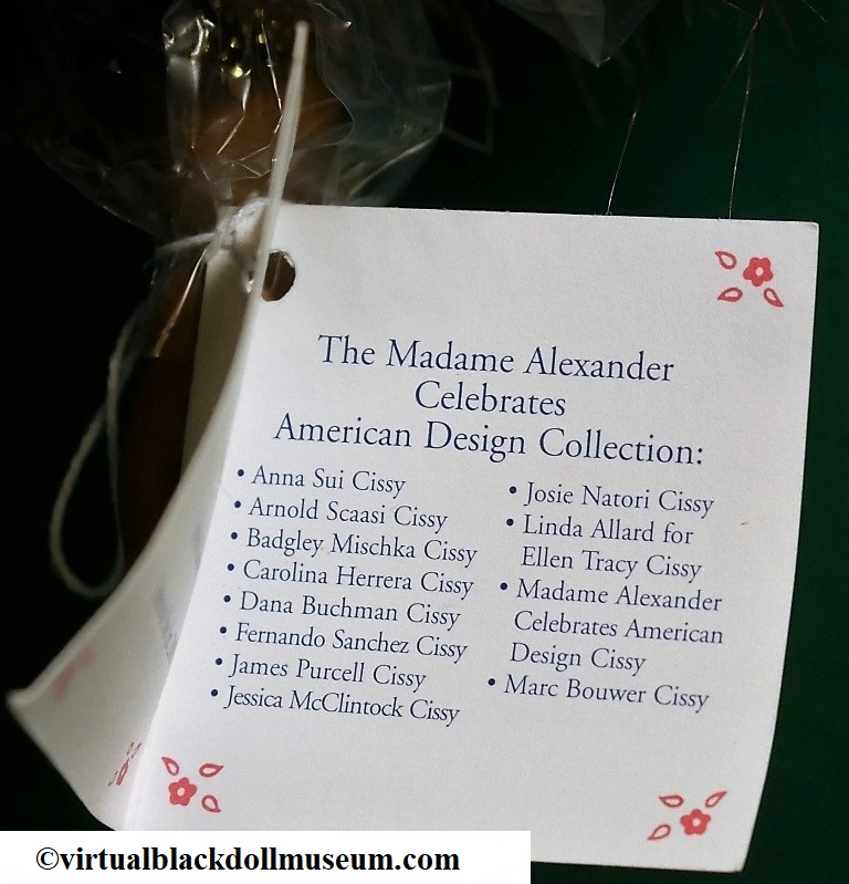 Other Cissys in the “Madame Alexander Celebrates American Design” collection at the time of Marc Bouwer Cissy’s release are listed on the inside of this doll’s hangtag. See the final gallery image.