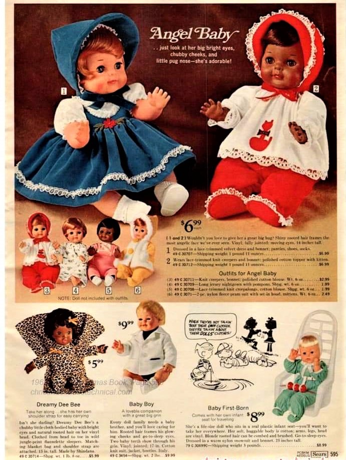 Other: Vogue’s Angel Baby was on the market from 1965-1968. Black Angel Baby with three white counterparts was advertised on page 599 of the 1969 Sears Christmas Book without listing Vogue as the manufacturer. This was the norm for many dolls sold through Sears catalogs, many of which were Sears catalog exclusives. Also advertised in the same catalog were four separately-sold outfits for Angel Baby (see gallery photos).