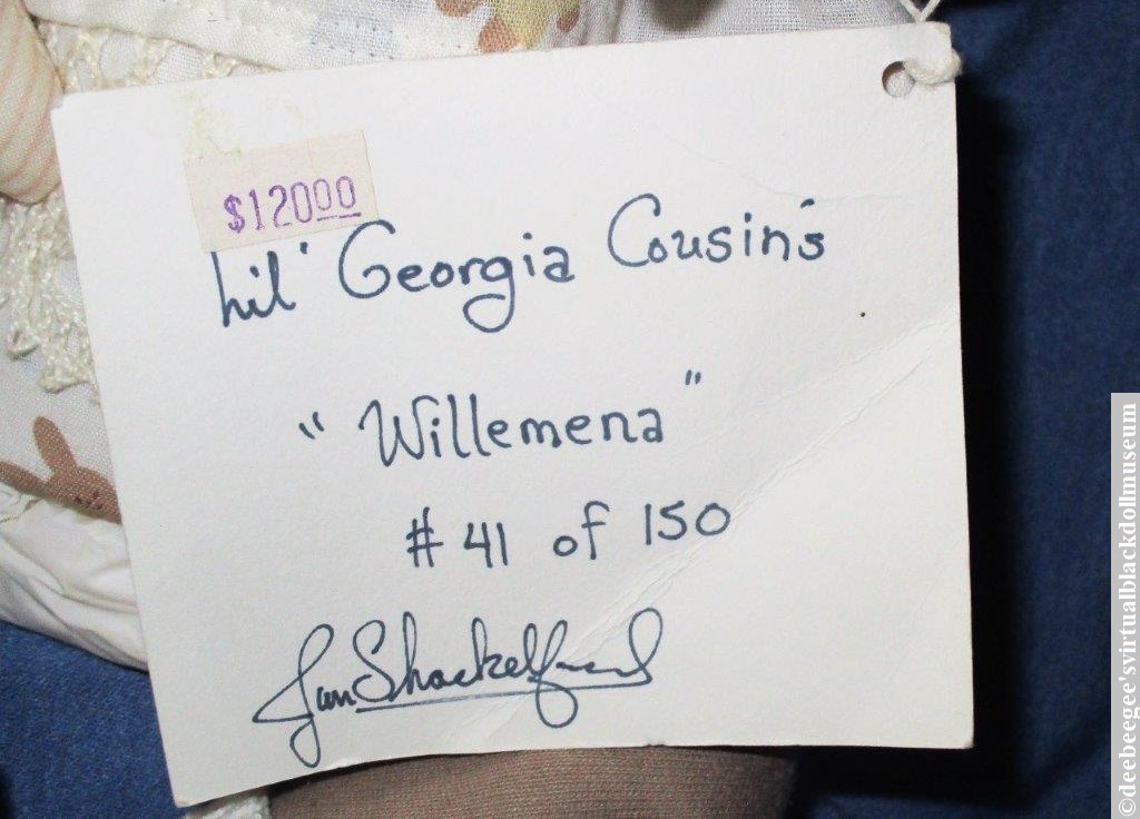 Hang Tag: The back of the hang tag reads, Lil Georgia Cousin’s / “Willemena” / #41 of 150 / [signature] Jan Shackelford