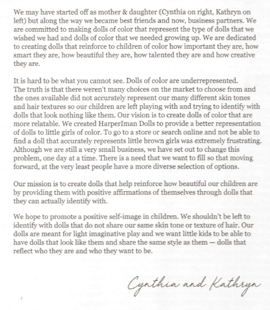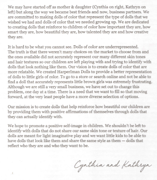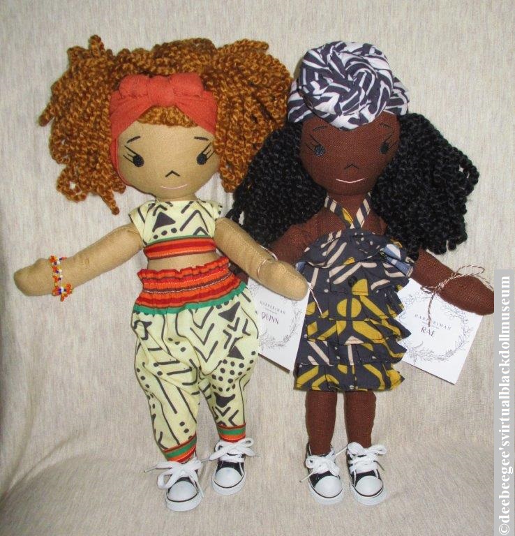 Other: Part of the original five-doll set sold at Target stores, online at Target, and FAO Schwarz, the HarperIman mass-produced dolls were created by an African American mother and daughter team whose bio is included on the back of the dolls’ boxes (see the last two gallery photos). HarperIman began making one-of-a-kind linen dolls before offering the mass-produced versions. Each mass-produced doll has a story on the back of its hangtag. Quinn is a lover of all animals and wants to be a veterinarian when she grows up. Rae enjoys being active and loves sports. Tennis is her favorite.