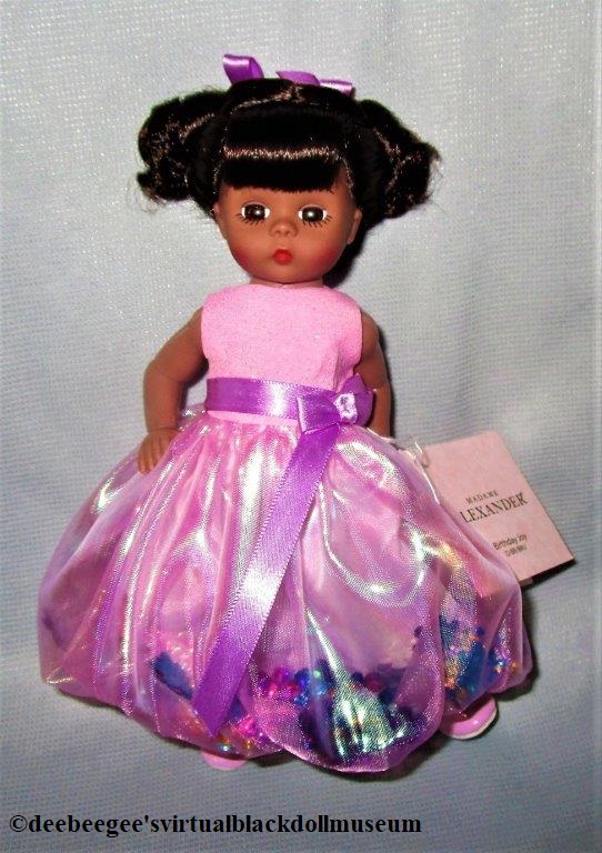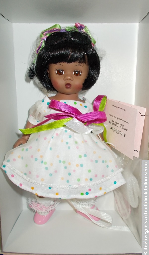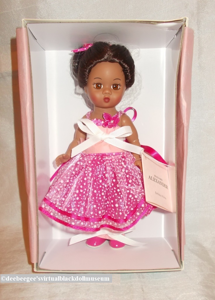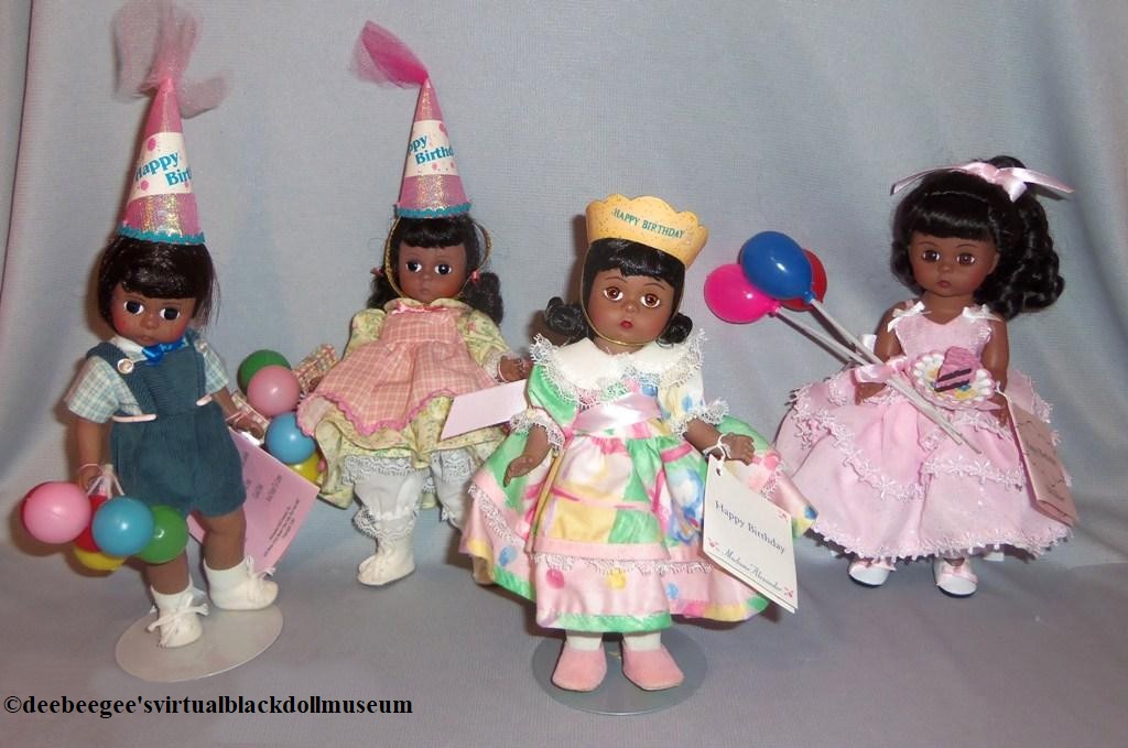 See the fourth gallery photo for a group picture of the following happy birthday dolls by Madame Alexander: Birthday Boy and Girl (1992), Happy Birthday Wendy (1999) and Happy Birthday Wendy 2005—these dolls also use the original Wendy face shared between Black and White dolls. Wendy’s appearance changed for the Black doll in 2004 with a dedicated African American (AA) head sculpt (Sheer Delight Wendy).