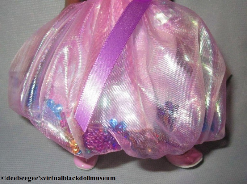 Clothes: Wears a pink sleeveless dress with a pink sheer iridescent bubble skirt lined with white satin. Between the two layers of the skirt fabrics are several pieces of multicolored confetti flowers. The dress has a purple sash at the waist. Tan shimmery tights and pink patent-leather ankle-strap shoes complete her outfit.