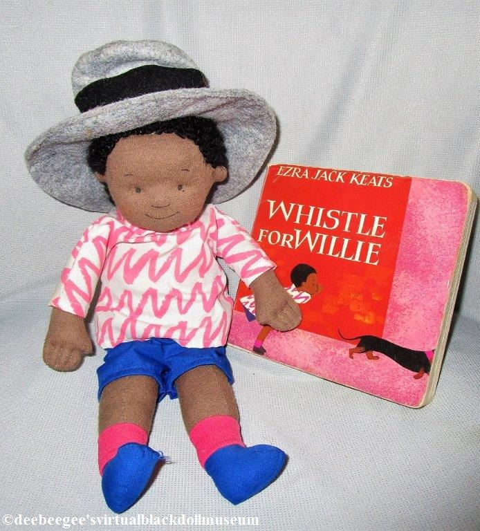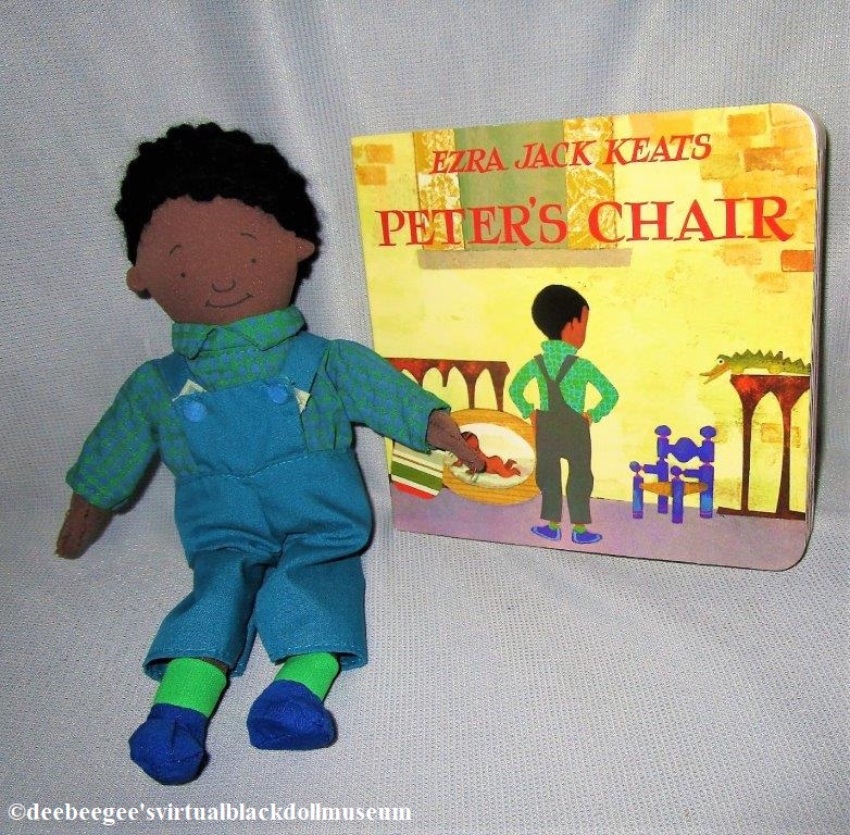 Other: Peter is the protagonist in the 1962 book, The Snowy Day, by Ezra Jack Keats. The Snowy Day is also the first children’s picture book to feature an African American protagonist. Ezra Jack Keats wrote a total of seven books that feature Peter. Three different cloth Peter dolls have been manufactured based on the characters from three books: The Snowy Day (1962), Whistle for Willie (1964), and Peter’s Chair (1967). Whistle for Willie Peter is 12 inches tall; Peter’s Chair Peter is 9 inches tall. Photos of Peter dolls and their associated books are included in the gallery.