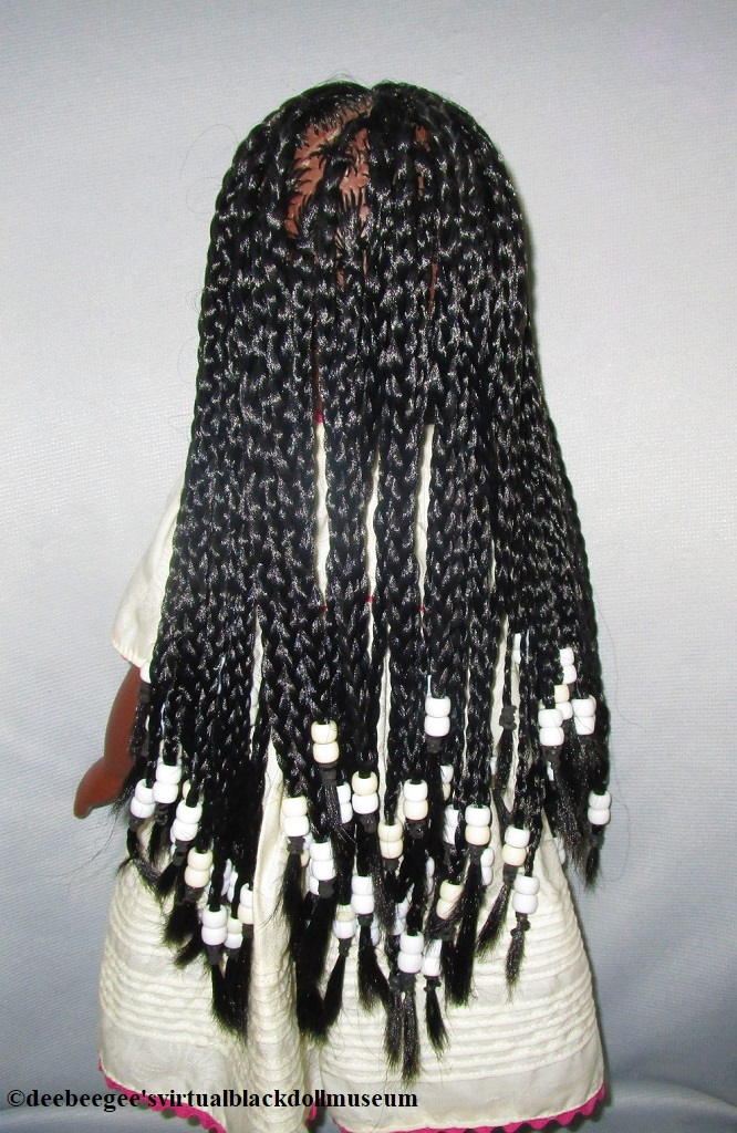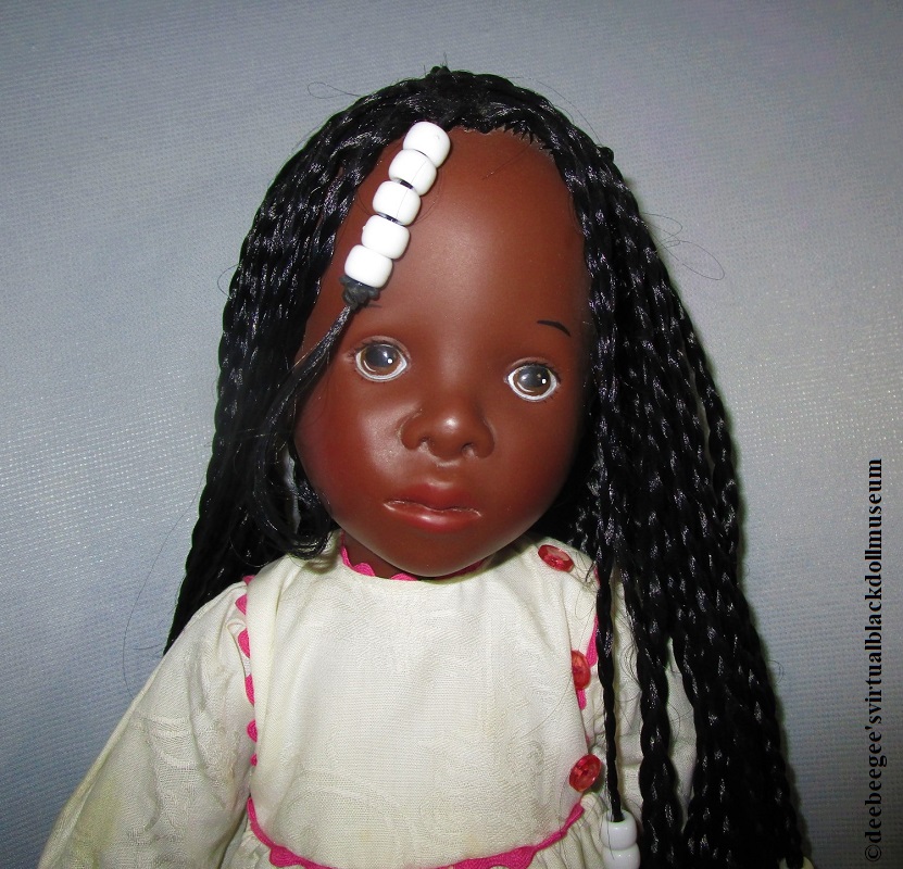 Hair, Eyes, Mouth: The now braided black rooted hair was originally straight as seen here; brown painted eyes, closed mouth.