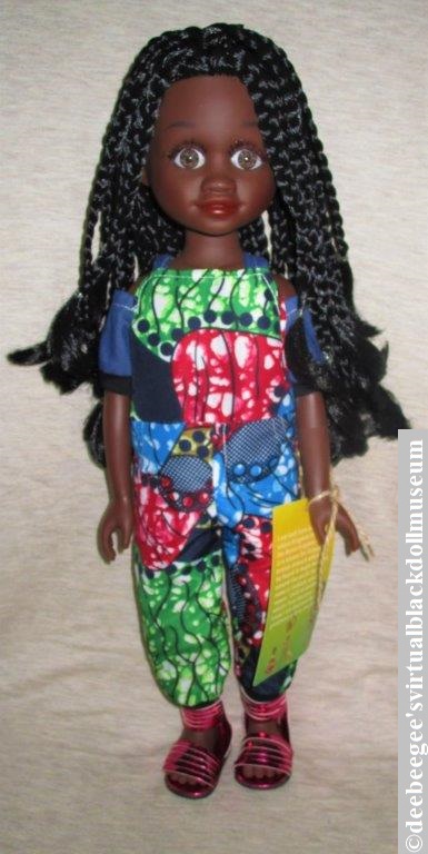 Clothes/Accessories: Ankara jumpsuit with cold shoulders and raspberry-colored Roman-style sandals; a hang tag has the doll’s brief bio on one side and the doll’s care instructions on the other. Also includes a certificate of authenticity signed by Ethel Rugba Alaka, President/CEO One Galaxy Toys Inc. and Alero Nwana, VP/Corporate Services One Galaxy Toys, Inc. Presented in a colorful box, illustrations of African women and children are on all sides. An image of a One Galaxy Toys doll group is on one side of the box.