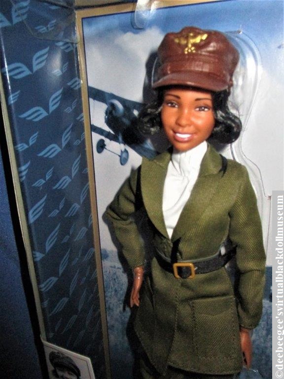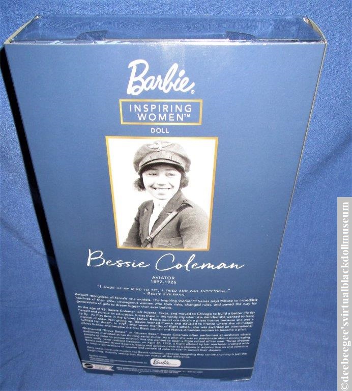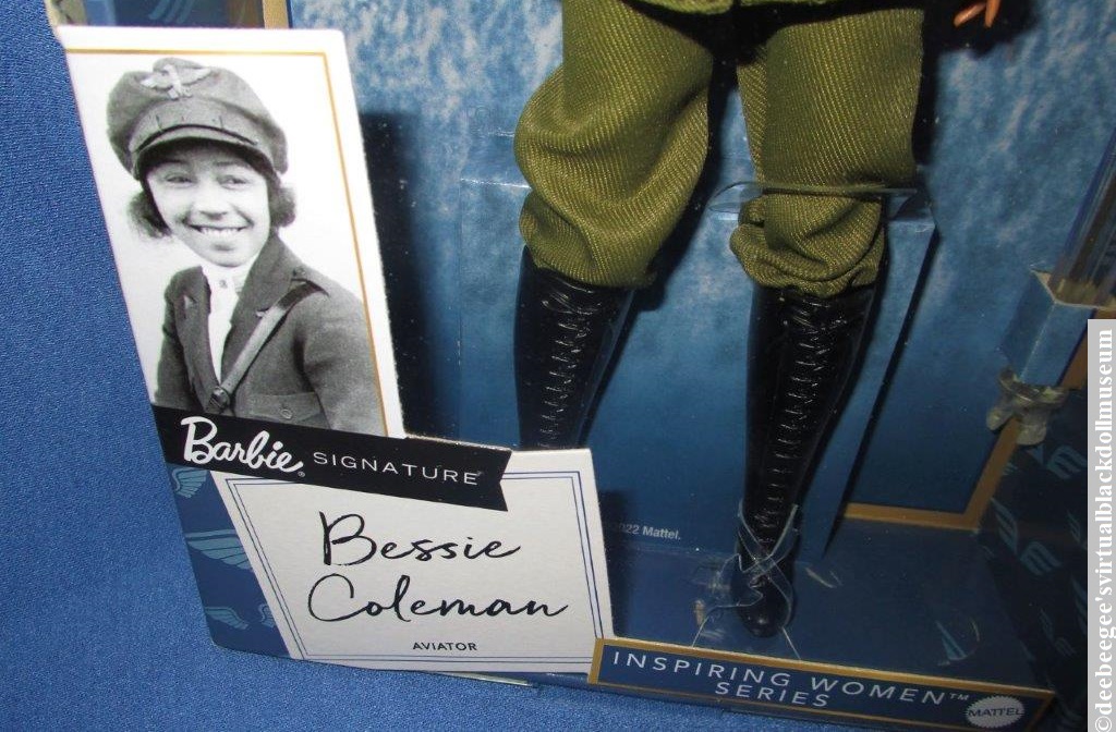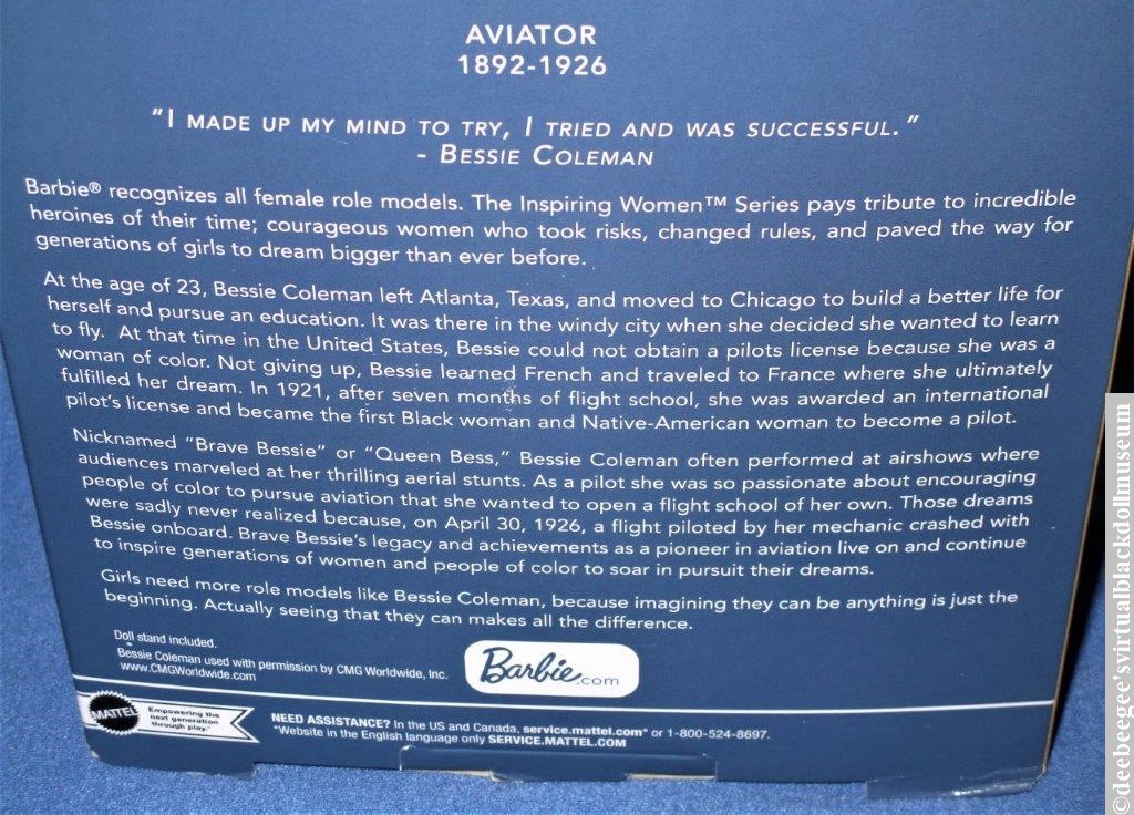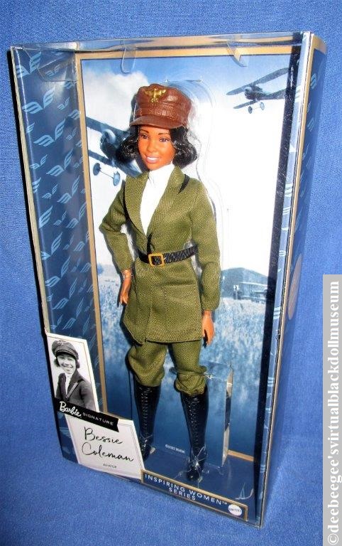 From the Barbie Signature Collection of the Inspiring Women Series, this doll represents Bessie Coleman who became the first African American/Native American woman to earn an international aviator license at age 23 in 1921. The license was earned in France because Coleman was prohibited from attending aviation school in America solely because of her skin color. Her determination helped her fulfill her goal despite the odds she faced in America.