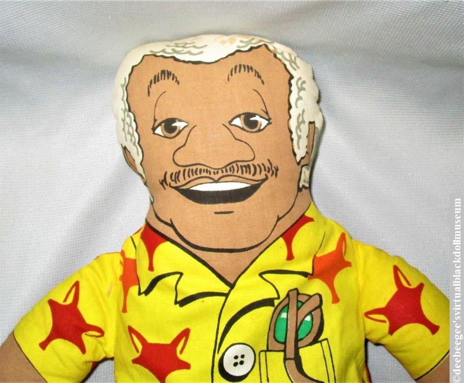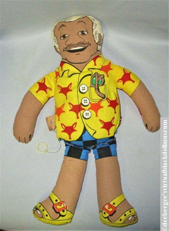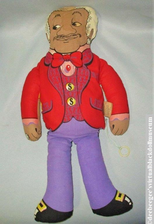 Other: This pull-string talker, two dolls in one, portrays the character Fred G. Sanford, Jr. from the popular 1970s-1980s Sanford and Son and Sanford sit-coms on one side and Redd Foxx the comedian and entertainer on the other. When the string is pulled, nine different phrases are spoken in the voice of John Elroy Sanford, which was Redd Foxx’s real name. Fred G. Sanford, Jr. was a character he modeled after his older brother who preceded him in death before the show became a reality. Redd Foxx was his stage name (Wikipedia).