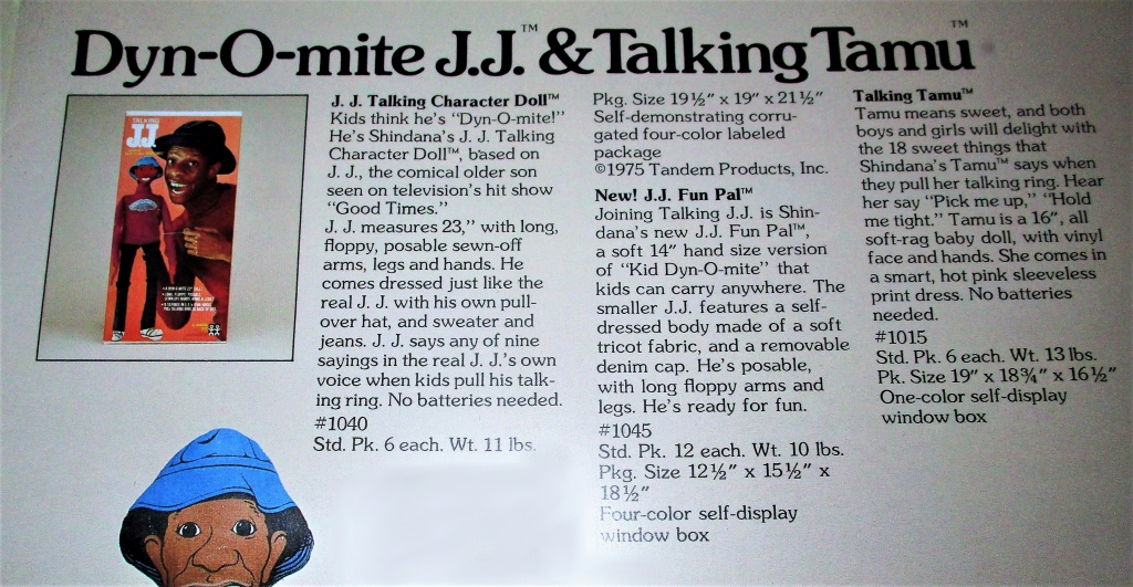 Other: Featured in the 1976 Shindana catalog, stock #1045, J. J. Fun Pal is the hand-size version of Shindana’s larger Kid Dyn-o-Mite doll. This posable doll is a portrait of Jimmy Walker in his role as J. J. Evans on the 1970s sitcom Good Times.