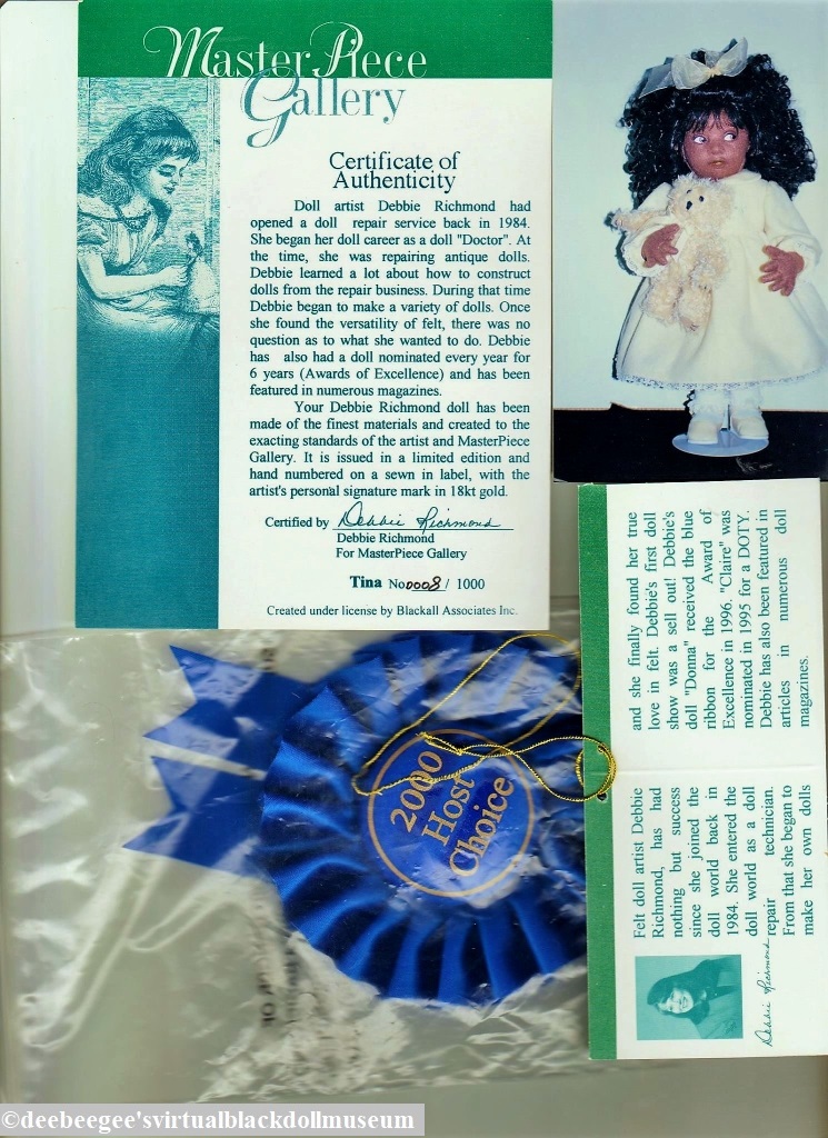 Other: The doll’s head tilts in the direction of the side-glancing eyes. Made in a limited edition of 1000, this doll is number 0008 in the edition. A doll stand, a hangtag, a certificate of authenticity, a full-length photo of the doll holding a different bear, and a 2000 Host Choice Award blue ribbon were included. Originally sold through the Home Shopping Network, this doll was possibly named for show host, Tina Berry.