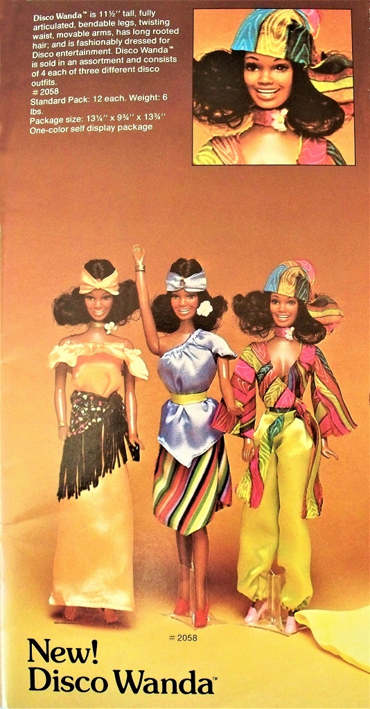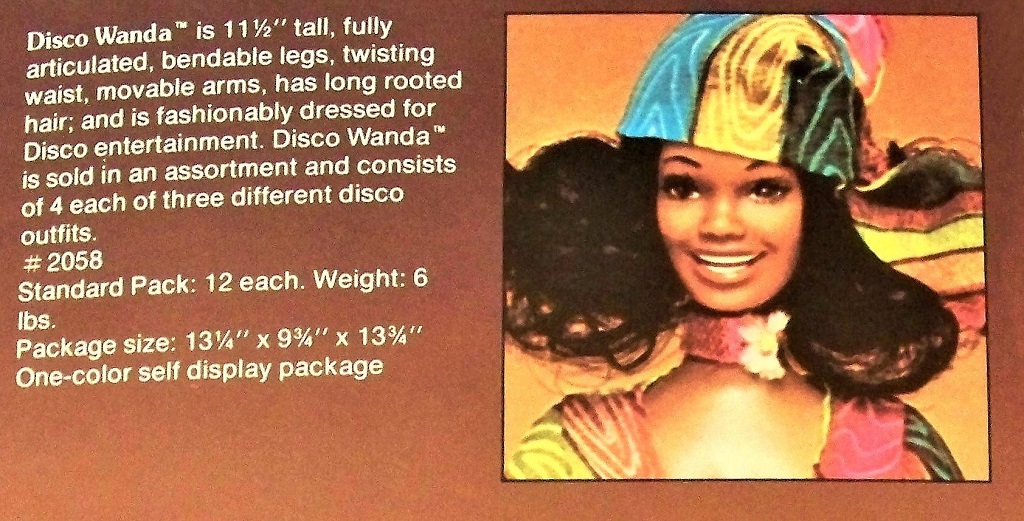 Other: Stock No. 2058, Disco Wanda was advertised as a new product in Shindana’s 1978 catalog. Disco Wanda is noteworthy for being Shindana’s first fashion doll of 11-1/2 inches. Representing a Latina, Disco Juanita was released after Disco Wanda’s 1978 release, possibly in 1979.