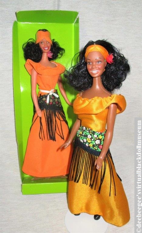 Clothes: Different brightly colored fabrics were used to dress Disco Wanda dolls in peasant-style dresses with fringe scarves tied at the waist; in top-and-skirt fashions, or in blouse-and-pants ensembles. All dolls wear fabric plastic-flower-accented headbands or scarves that match the colors and material of the clothes, white panties, and coordinating shoes. Disco Juanita and the Wandas that wear headscarves wear a plastic flower choker.