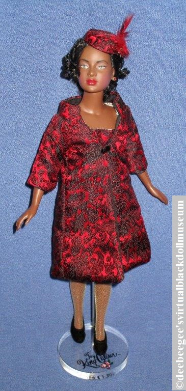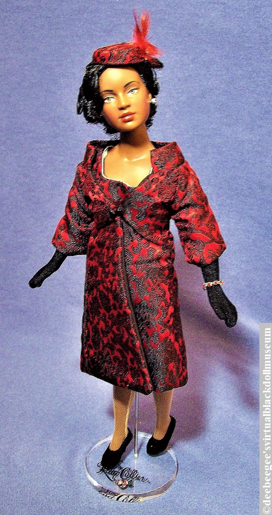 Fashion Plate Dottie wears a red and black brocade sheath with a matching coat and pillbox hat that has red feather and faux ruby accents, flesh-tone fishnet stockings, black faux suede pumps, and faux ruby stud earrings. As seen in the final gallery image, Fashion Plate Dottie was released wearing black above-elbow gloves and a faux ruby tennis bracelet.