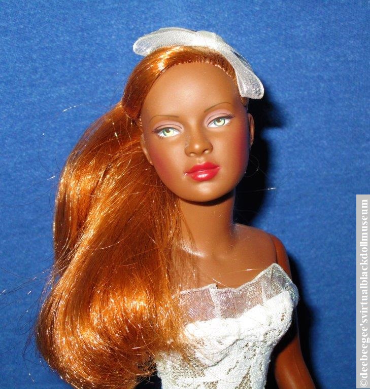 Hair, Eyes, Mouth: Basic Dottie has an auburn-rooted ponytail with side-swept bangs. Both dolls’ eyes are painted green with faintly painted upper and lower eyelashes and neutral eyeshadow. The mouths are closed. Fashion Plate Dottie’s black hair is rooted and styled in a curly chignon with curls that frame the face.