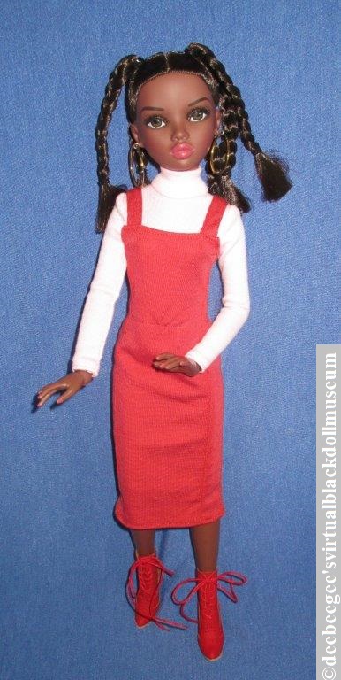Hair, Eyes, Mouth: Has six squared-off rooted dark-brown braids (the front two are wired), dark-brown painted eyes with applied upper eyelashes and painted lower eyelashes, a closed pouty mouth with coral lip color on her full lips.