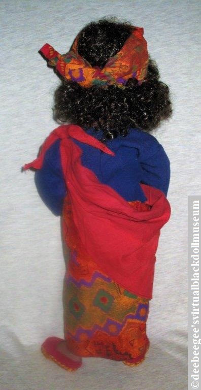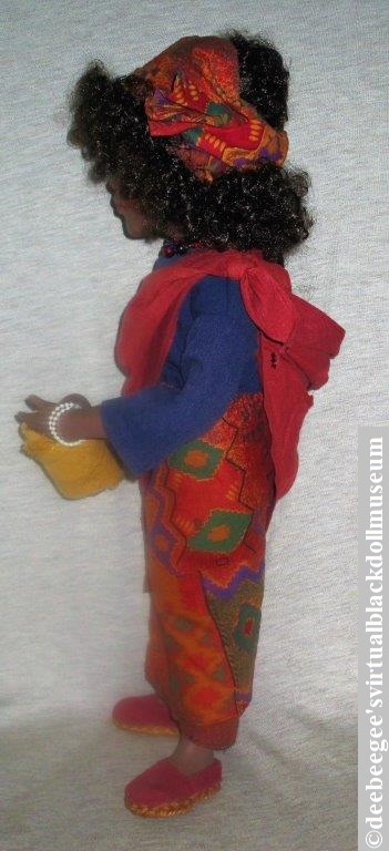 Clothes: Wears a West African-inspired fashion of blue shirt, rust-colored wrap, and rust and green print full-length wrap skirt or lapa with rust-colored canvas rope-soled shoes. A gele that matches the fabric of the skirt, gold hoop earrings, several beaded necklaces, and a double-stranded white bead bracelet complete the fashion. Missing is a basket of grain/wheat.
