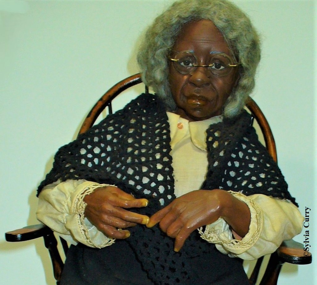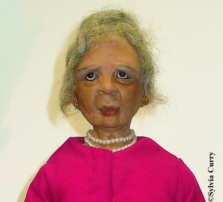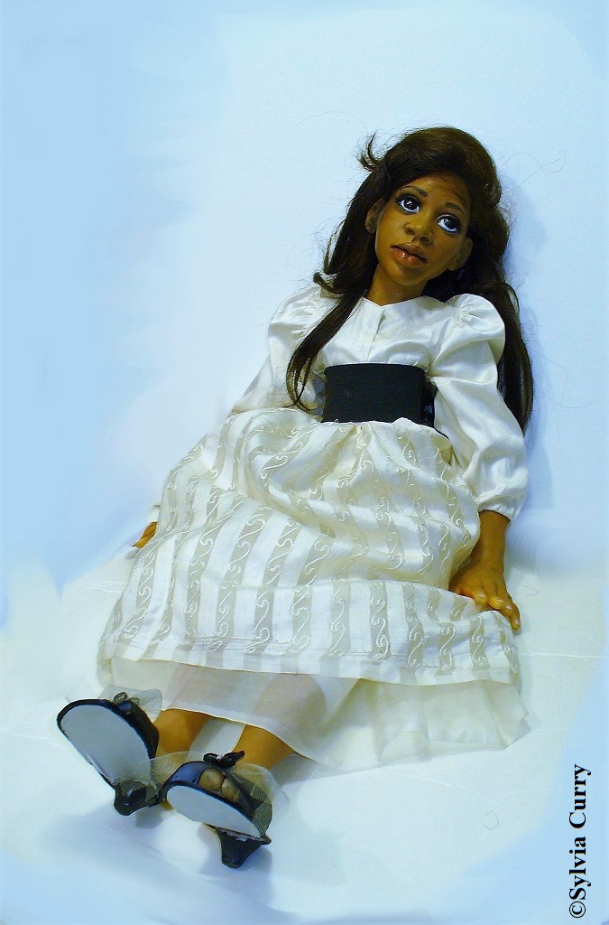 About the Artist: Sylvia Curry has been making dolls for over 30 years without the use of molds. According to Curry, her dolls are “just straight sculpting out an idea.” She started with porcelain but now prefers polymer clay. The polymer clay dolls have cloth bodies. She makes the wigs, clothing, and shoes for each doll. Sylvia Curry signs the dolls when they sell. At the time of this installation, Curry is working on a fully-jointed BJD (ball-jointed doll).