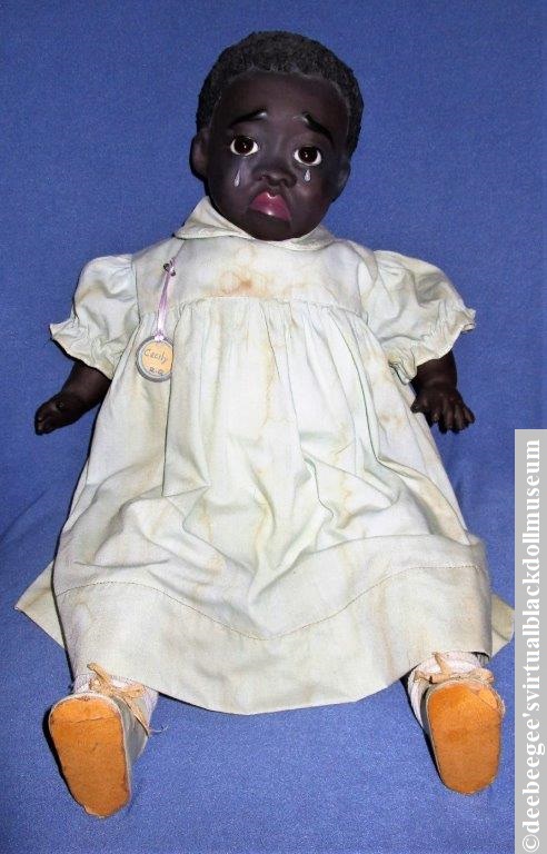 Other: As documented in part 3 of the Ebony-Essence of Dolls in Black four-part series on Leo Moss Dolls, Cecily’s former owner purchased the doll at a UFDC Convention in Indianapolis in 1992. (This might have been a regional event.) Cecily is also featured on page 417 in Black Dolls an Identification and Value Guide Book II by Myla Perkins wherein the former owner provides a description of Quintano’s doll-making process—stripping the paint from composition dolls, repainting them and remolding the head with Moss doll characteristics resulted in his nice Moss doll replicas… Quintano added new inset eyes and new bodies. Note that in Black Dolls… Book II, Cecily’s name is spelled “Cicely” and the doll’s height is recorded as 23 inches (58 cm).