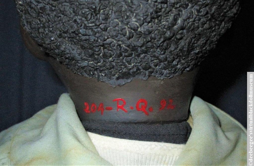 Little else is known about doll artist, Rubin Quintano, who made one-of-a-kind dolls during the 1990s in the fashion of late 19th-century doll maker Leo Moss. Quintano’s dolls possibly date back to the 1970s or 1980s, but 1990s examples have been documented. His dolls are notable for their tightly coiled sculpted hair, down-turned mouths, big brown eyes, and sometimes tears. They can often be mistaken in pictures for authentic Leo Moss dolls. The smooth texture of his dolls’ faces and extremities is a major difference between Quintano’s Moss-type dolls and authentic Leo Moss dolls. Quintano’s dolls usually bear his initials and/or numbers that precede and follow the initials.